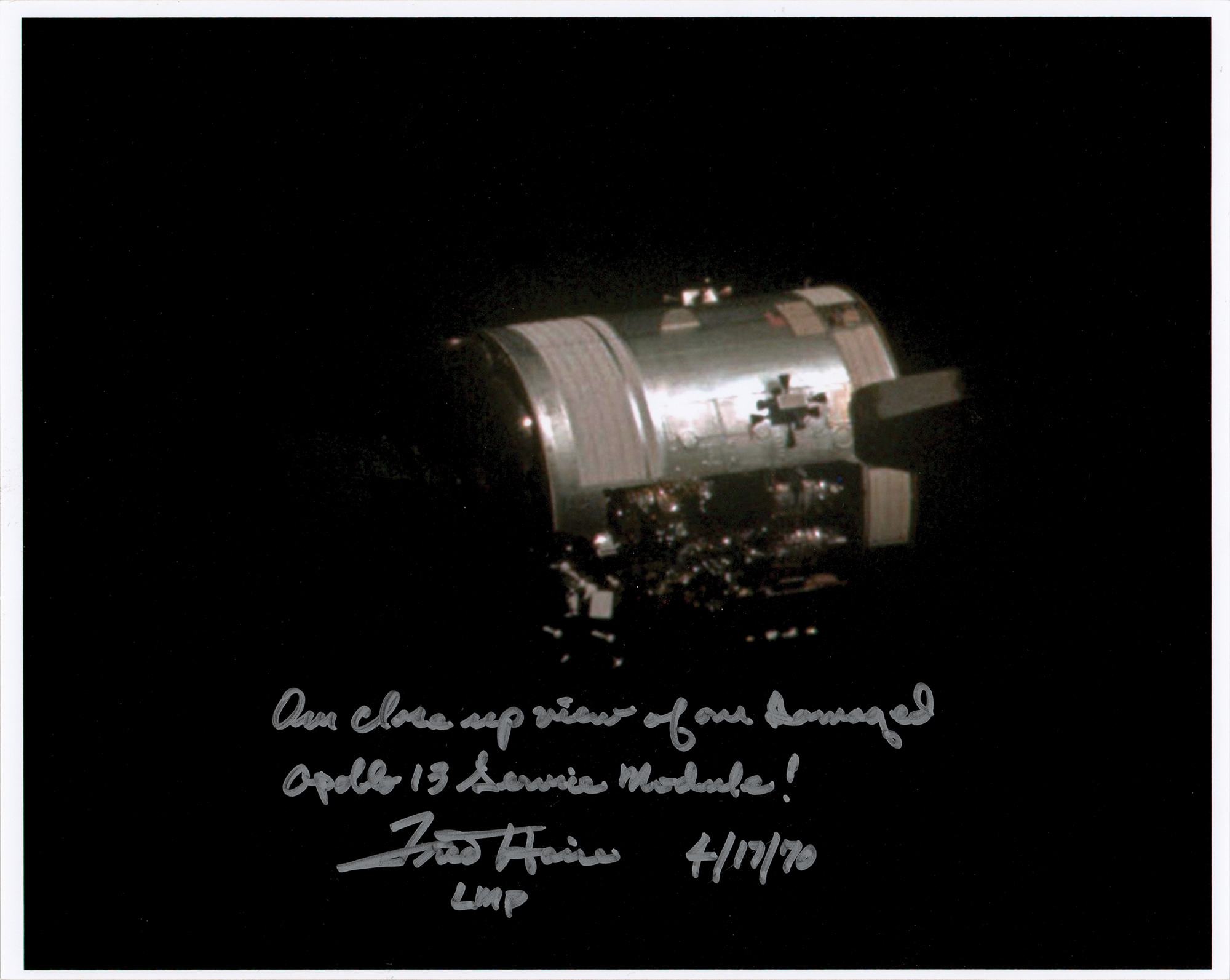 Color satin-finish 10 x 8 photo of the crippled Apollo 13 service module floating in space, signed in silver ink, "Our closeup view of our damaged Apollo 13 Service Module! Fred Haise, LMP, 4/17/70." In fine condition, with a light bend to the lower right corner area.