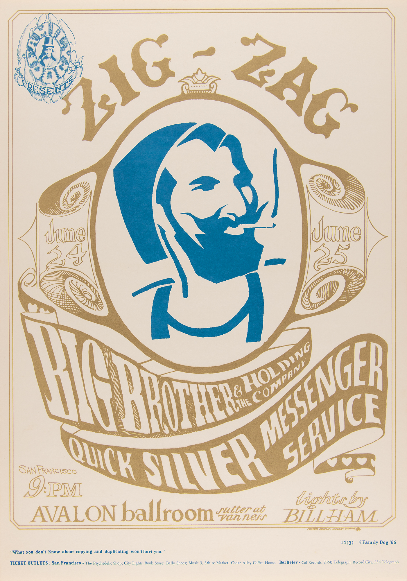 Original third printing color 14 x 20 Family Dog concert poster (FD-14-3) for the Big Brother and the Holding Company and Quicksilver Messenger Service shows at the Avalon Ballroom on June 24 and 25, 1966, carrying the famous 'Zig-Zag Man' image appropriated from the logo for Zig-Zag rolling papers. Designed by Alton Kelley and Stanley Mouse, with the Mouse Studios credit printed in the lower right. In fine condition.