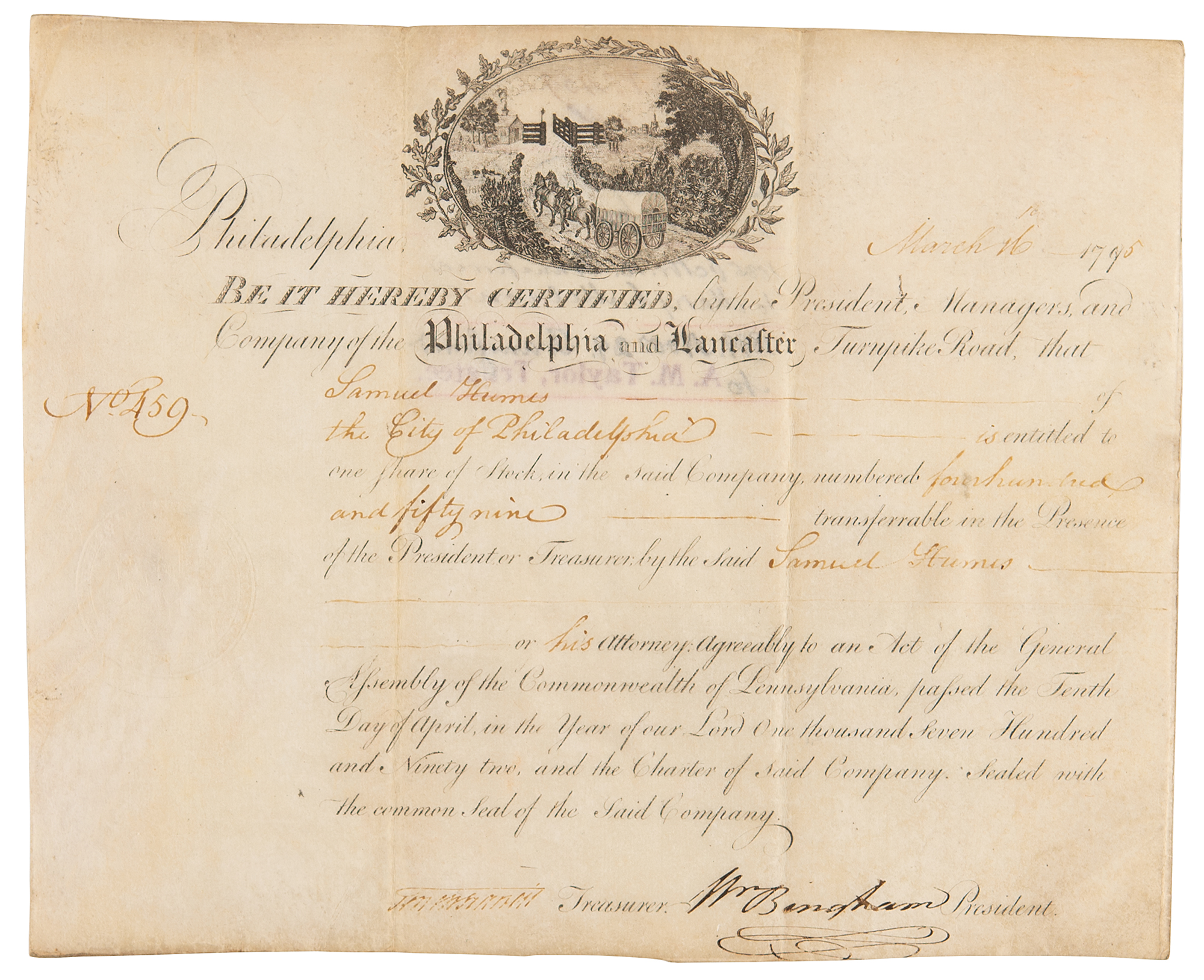 American statesman (1752-1804) who served in the Continental Congress from 1786 to 1788 and in the United States Senate from 1795 to 1801, including a five-month stint as president pro tempore. Partly-printed vellum DS, signed “Wm. Bingham,” one page, 9.5 x 7.75, March 16, 1795. Stock certificate issued to Samuel Humes for one share of stock in the Company of the Philadelphia and Lancaster Turnpike Road, with the upper section featuring an engraved vignette of a horse-drawn wagon on the aforenamed road. Signed at the conclusion by William Bingham as president, and countersigned by its treasurer, Tench Francis, Jr., who served as the first cashier of the Bank of North America. In fine condition, with multiple vertical folds.