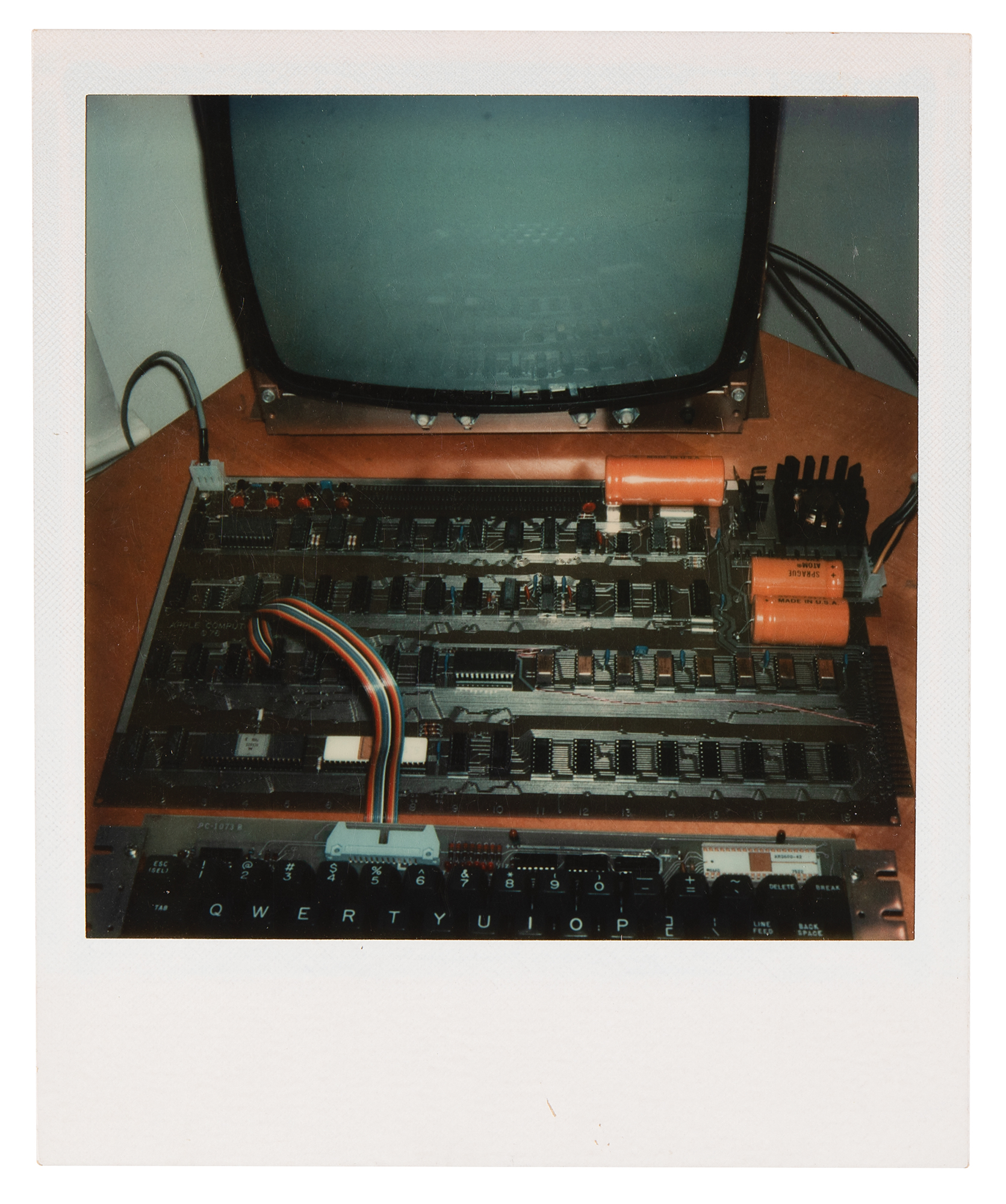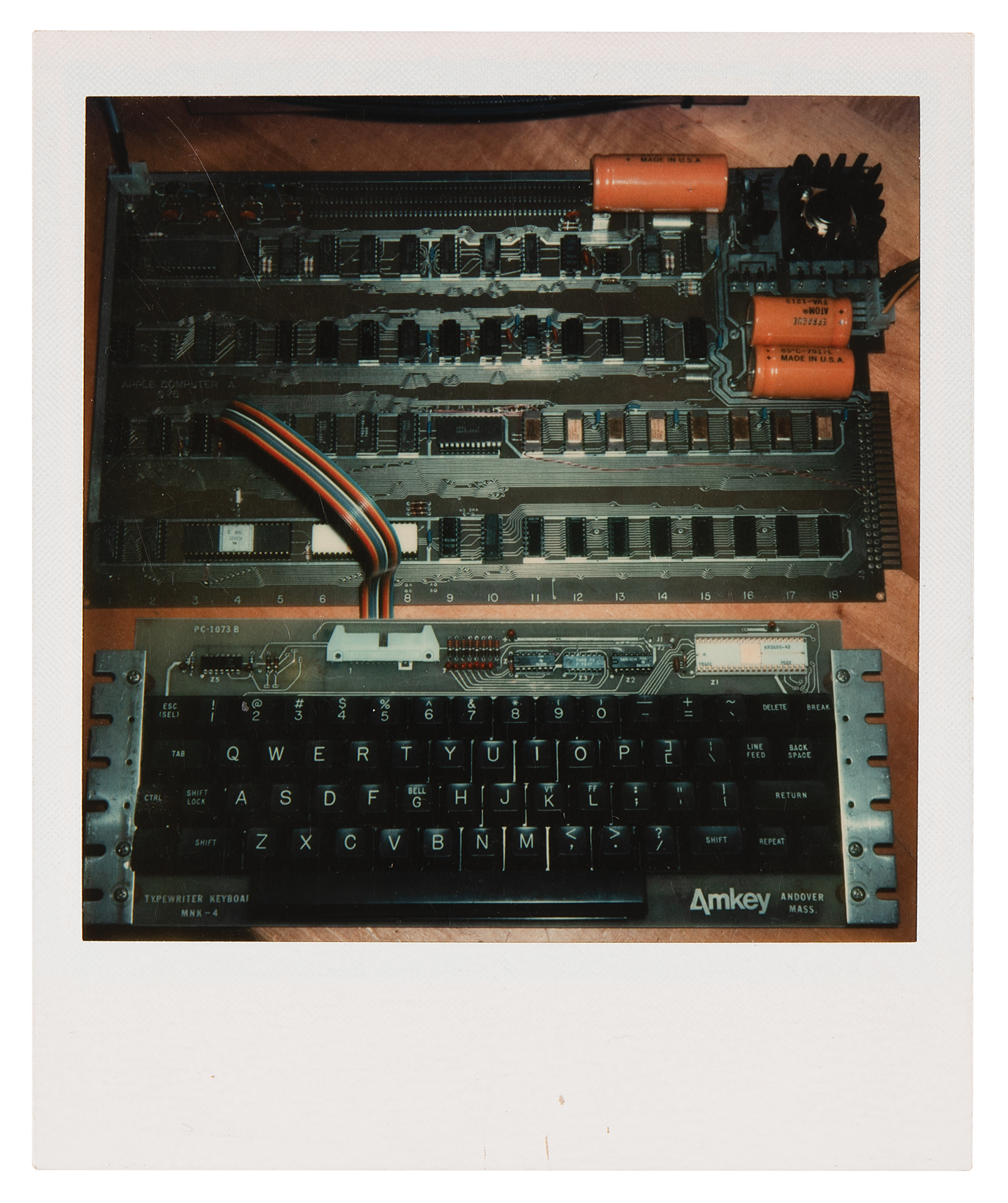 The Polaroids show Steve Jobs's prototype Apple-1 board (then denoted "Apple Computer A") hooked up to an uncased Amkey keyboard and standard CRT video monitor: one photo shows an overview of the setup, one shows a closer angle of the computer board itself, and the other shows the computer in action, with a program running on the screen that concludes in: "This is the Apple Computer-1." In overall fine condition.