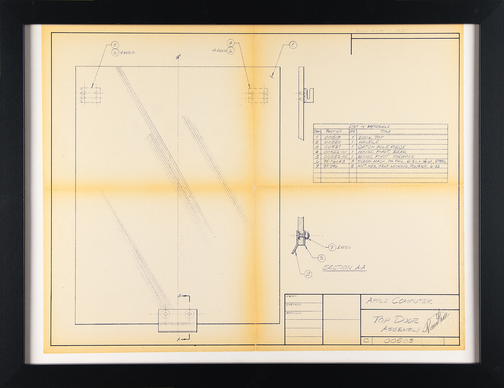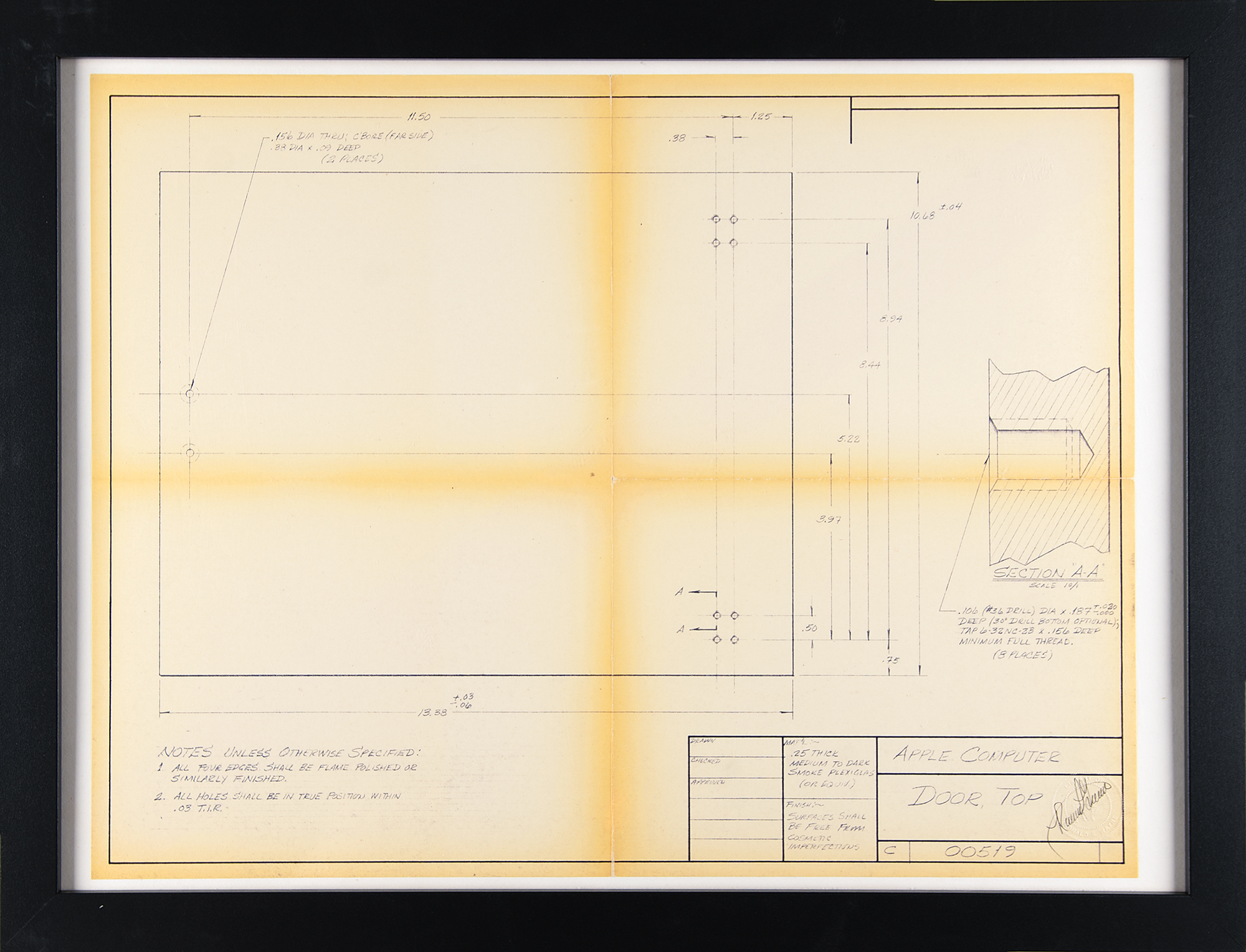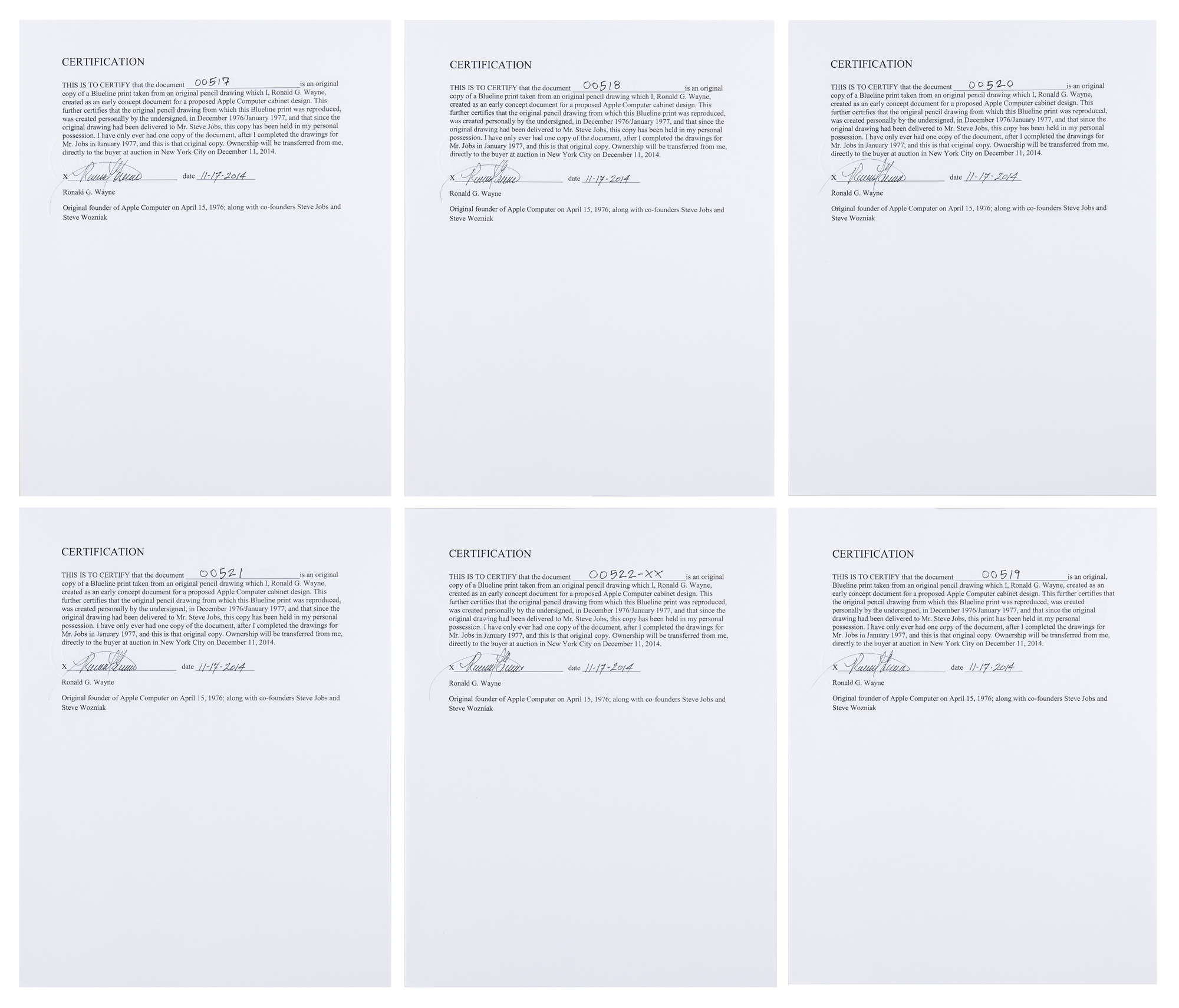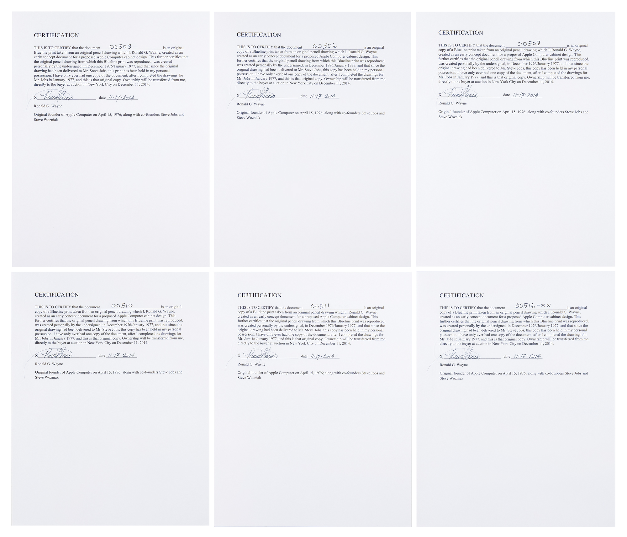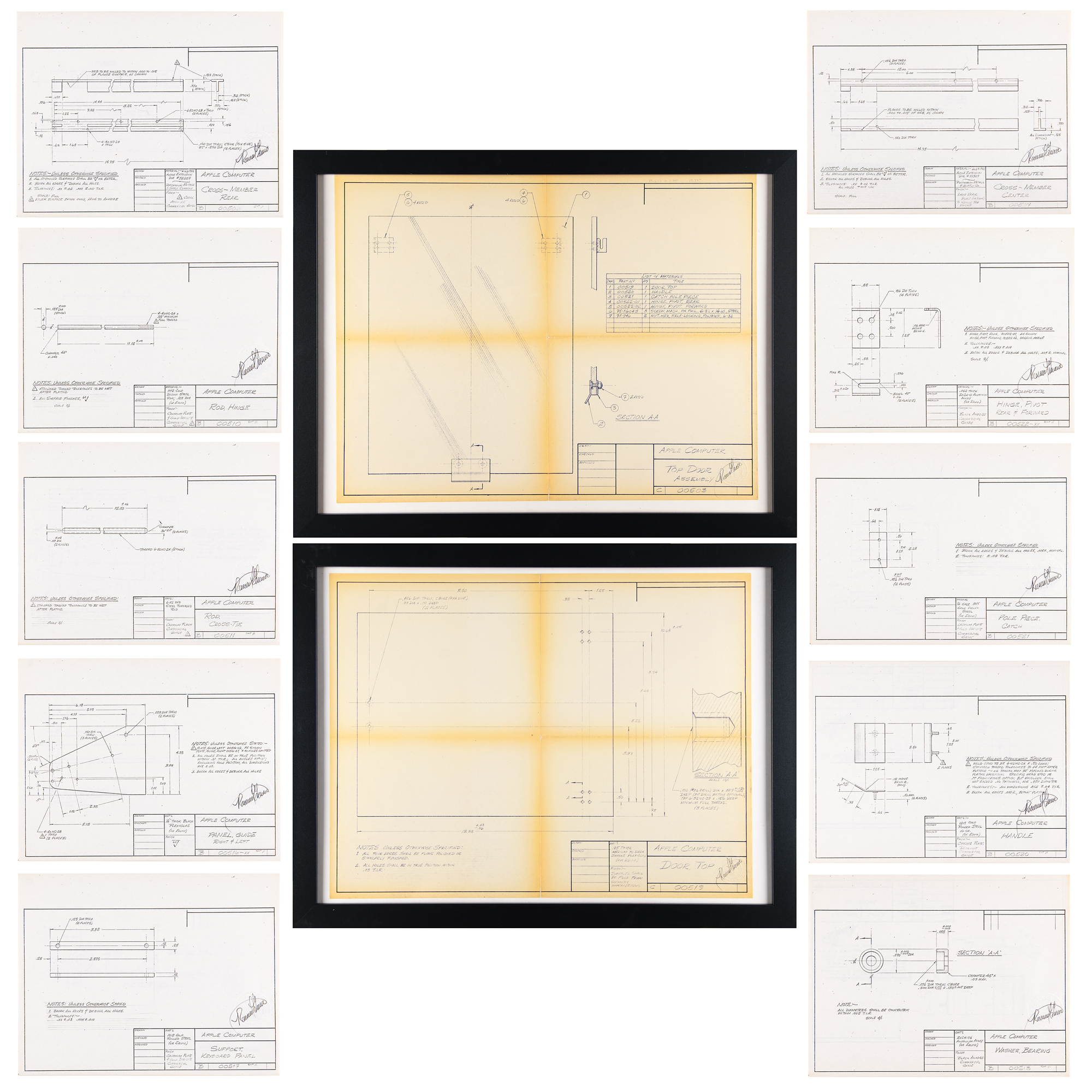 The “B” blueprints are individually mounted and framed to an overall size of 26 x 20. In overall fine condition, with toning to intersecting folds of larger blueprints. Accompanied by a signed certificate of authenticity from Wayne for each blueprint, with all attesting that each was “taken from an original pencil drawing which I, Ronald G. Wayne, created as an early concept document for a proposed Apple Computer cabinet design. This further certifies that the original pencil drawing from which this Blueline print was reproduced, was created personally by the undersigned, in December 1976/January 1977, and that since the original drawing had been delivered to Mr. Steve Jobs, this print has been held in my personal possession. I have only ever had one copy of the document, after I completed the drawings for Mr. Jobs in January 1977, and this is that original copy.”