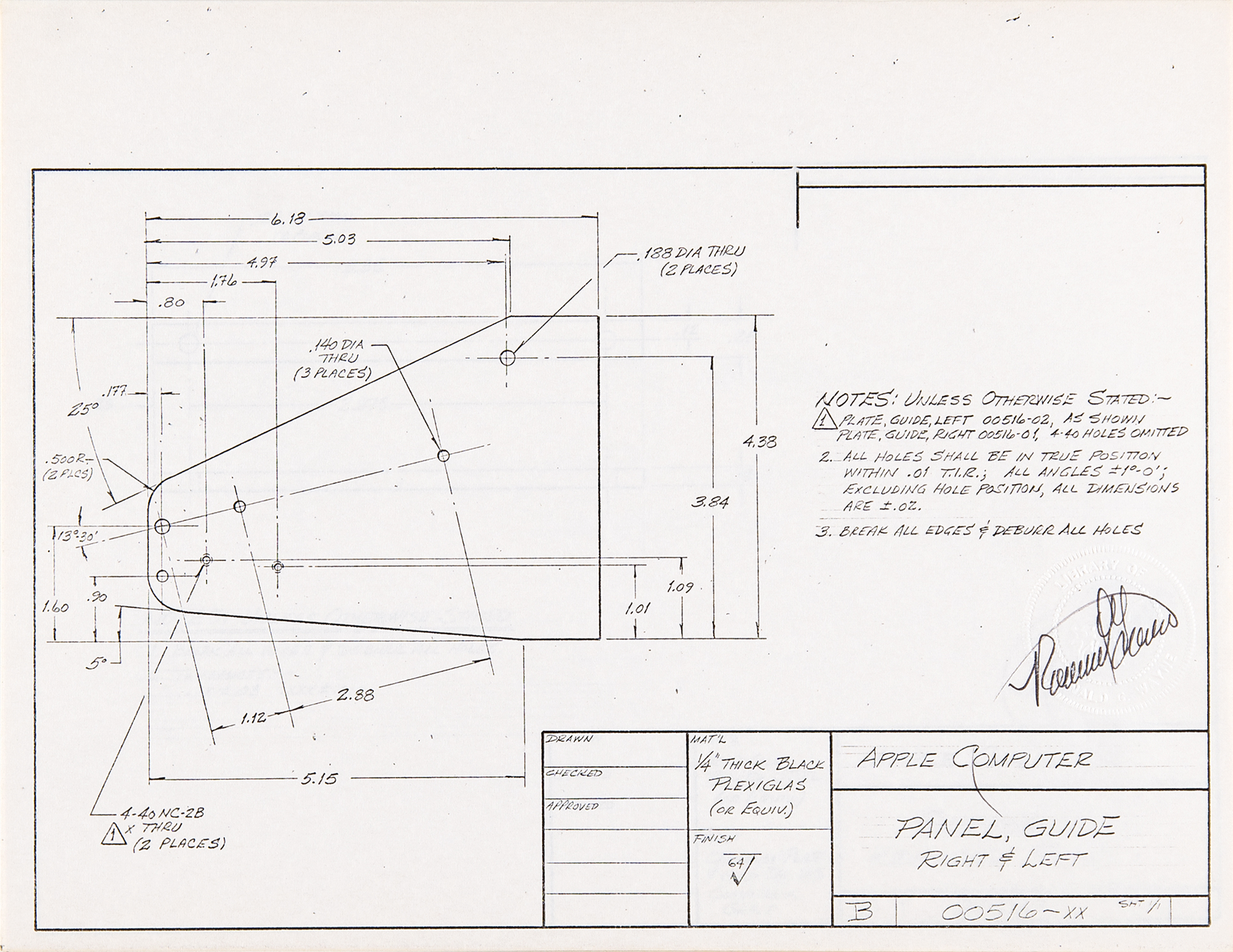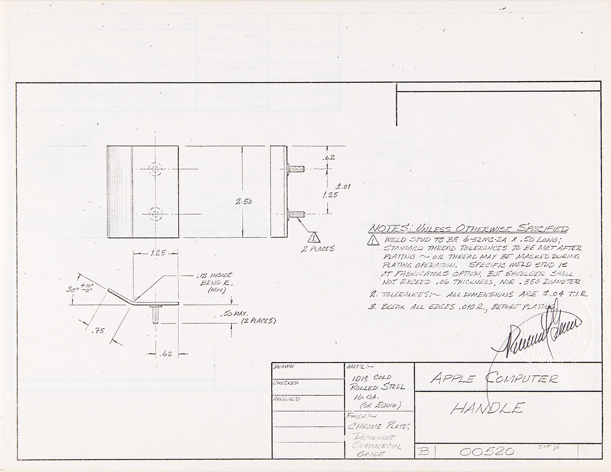 Ron Wayne’s original collection of 12 diagram blueprints for the cabinet design of the Apple II personal computer, each signed in black ink by the Apple co-founder, "Ronald G. Wayne,” who signs over his embossed personal seal. The collection includes two large-sized 22 x 17 blueprints (marked “C”) and 10 smaller sheets (marked “B”) measuring 11 x 8.5, with each blueprint identified in the “Apple Computer” key to the lower right with the subject name, and with sheet and document numbers.