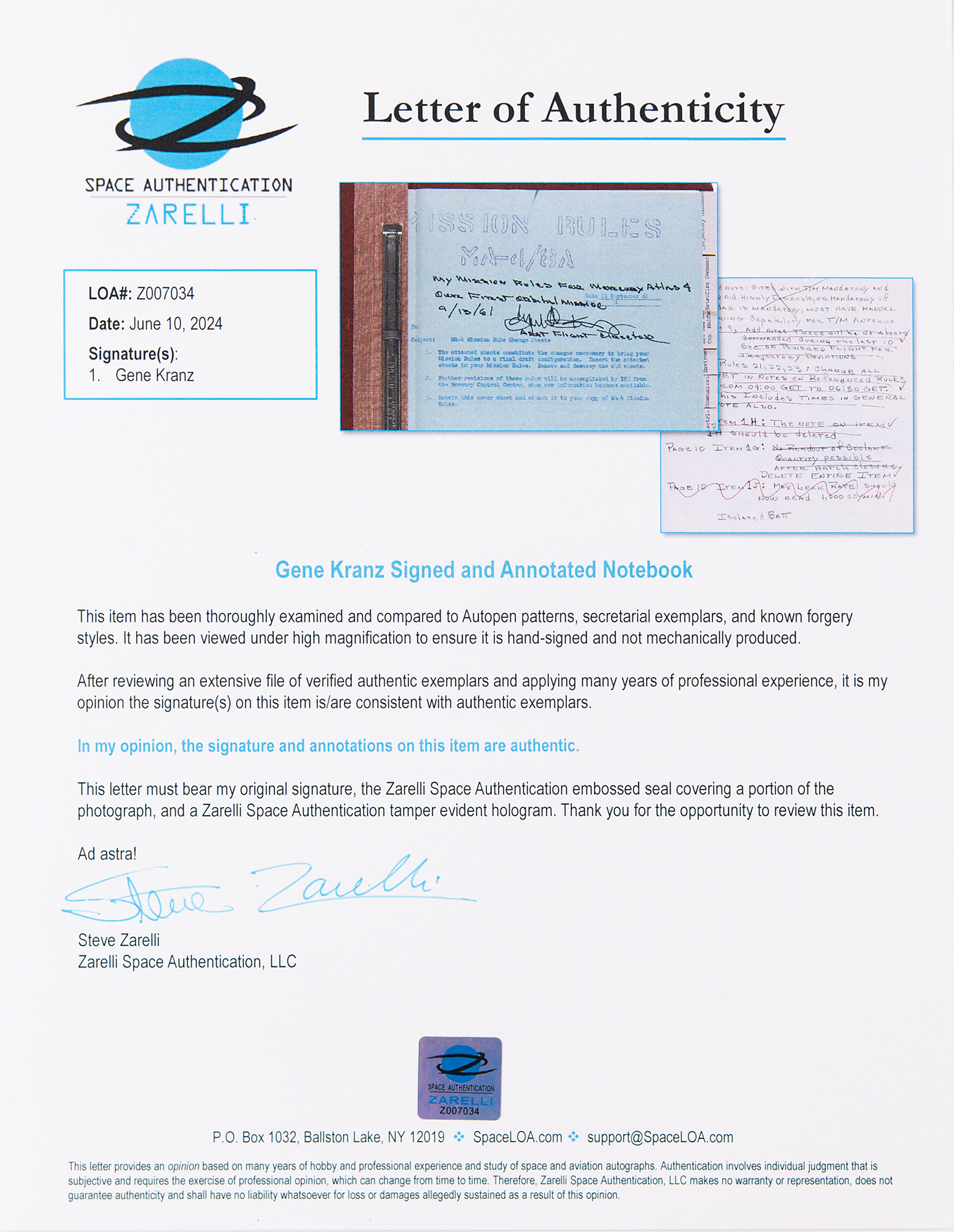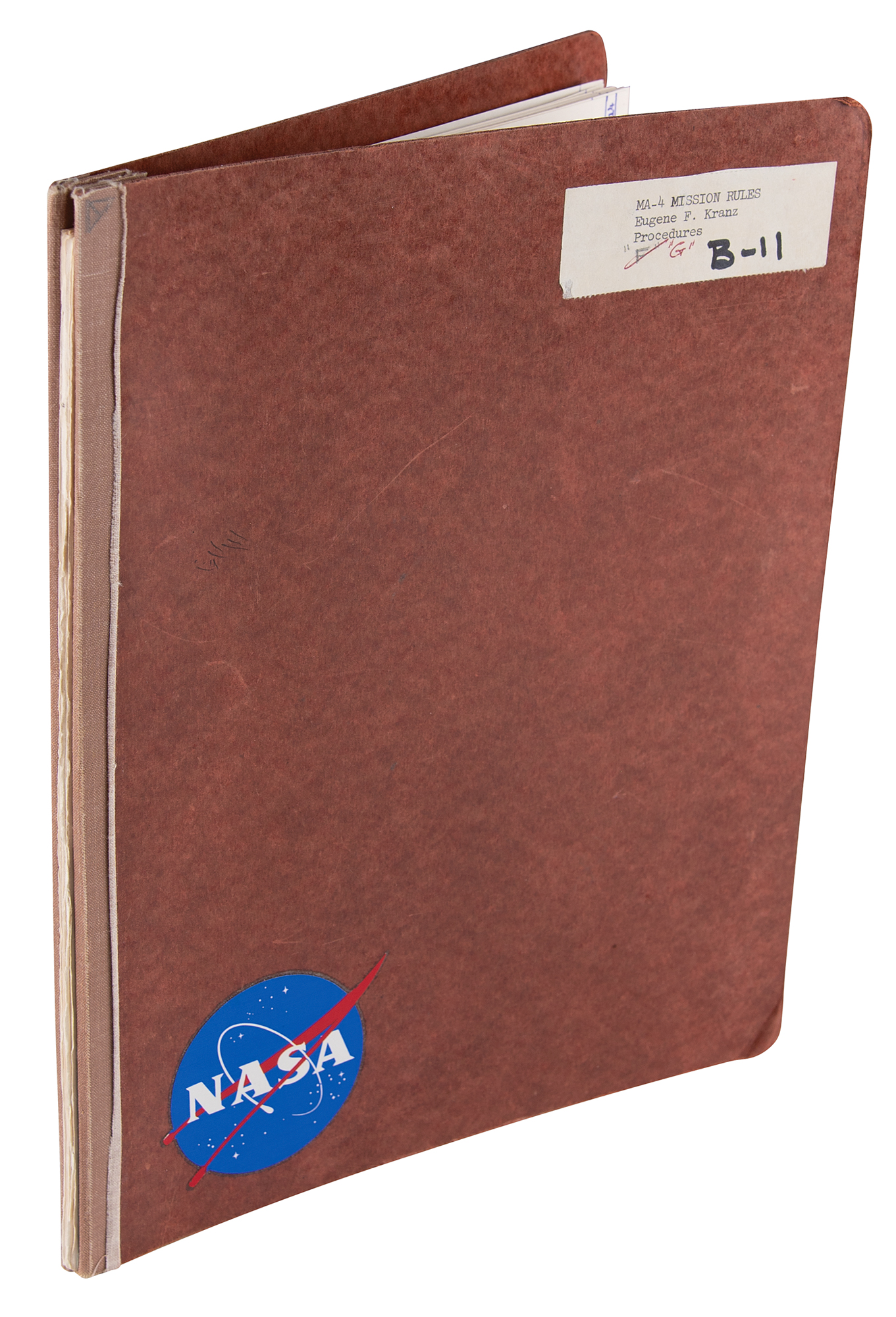 Flight Director Gene Kranz's original mission rules from Mercury-Atlas 4, the first American unmanned orbital space flight on September 13, 1961, 8.5 x 11, 29 pages fastened within a 9 x 11 binder with a NASA logo sticker and an adhesive with the typed notation, "MA-4 Mission Rules. Eugene F. Kranz. Procedures." The letter "F" has been written by hand and then crossed out, with the letter codes "G" and "B-11" subsequently added. Issued to Gene Kranz, the first page is signed in black felt tip, "My mission rules for Mercury Atlas 4, our first orbital mission, 9/13/61, Eugene F. Kranz. Asst. Flight Director." The second page features handwritten notations in pencil, documenting changes made to the mission rules. In fine condition. Accompanied by a letter of authenticity from Zarelli Space Authentication.