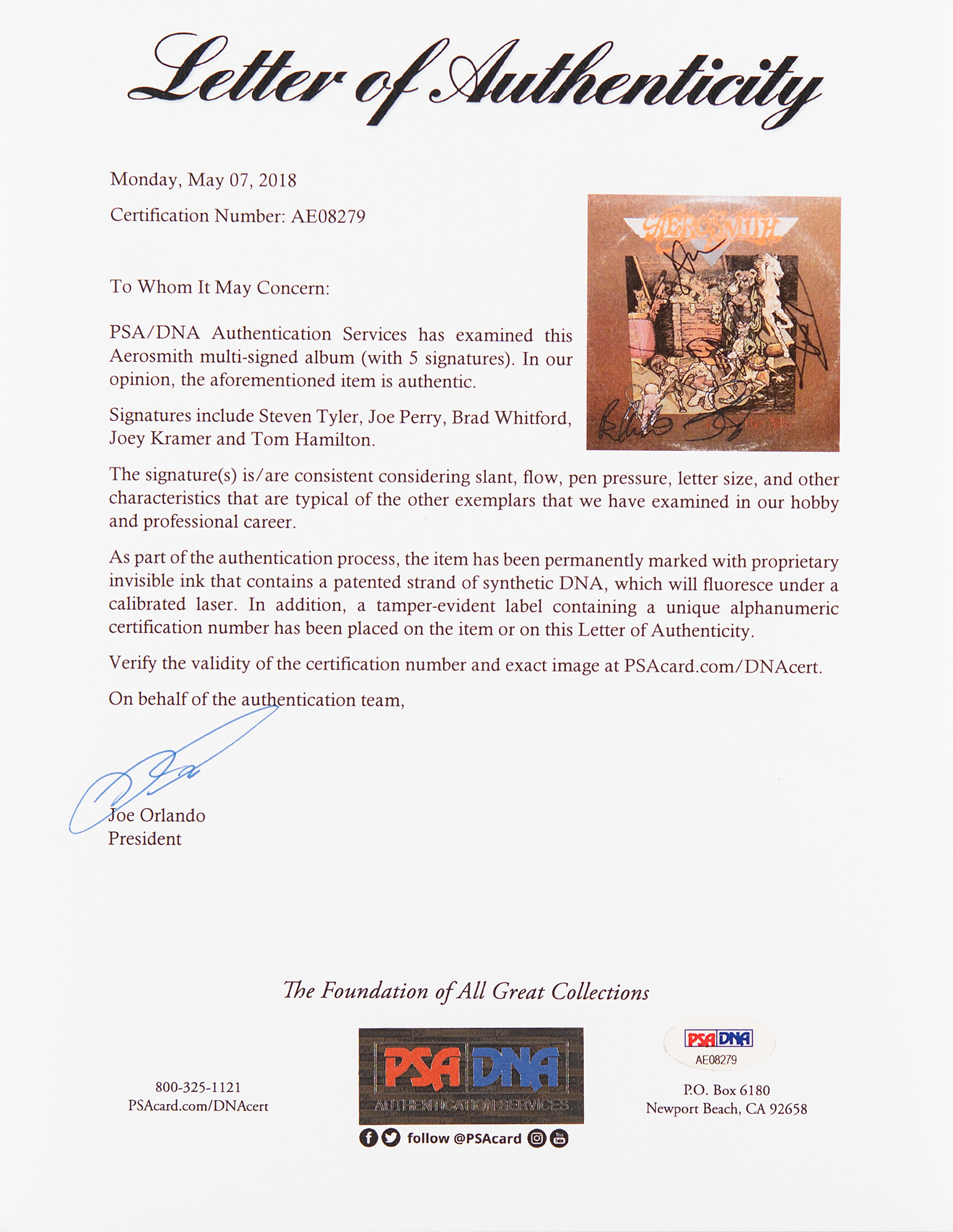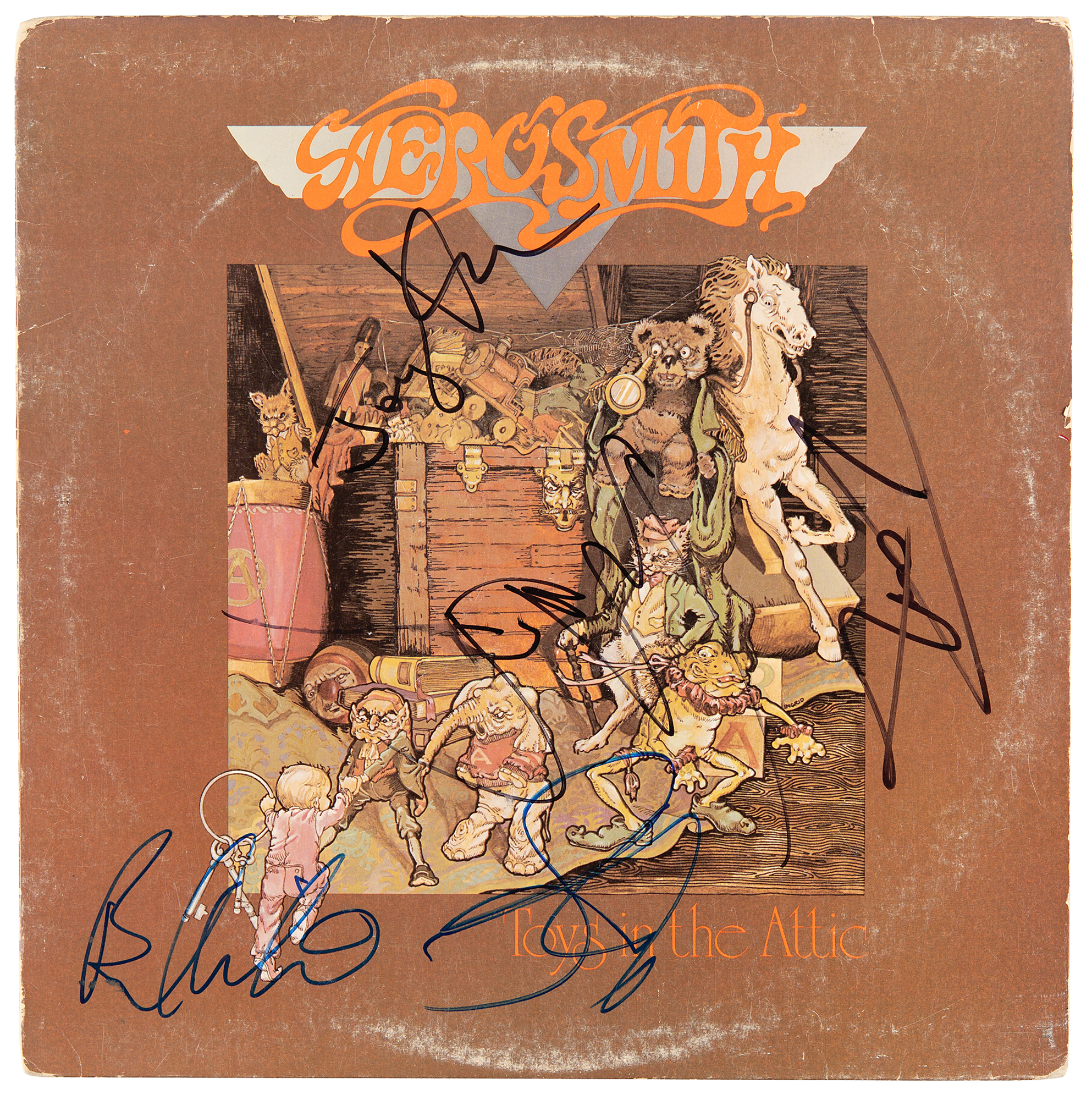 Toys in the Attic album by Aerosmith, signed on the front cover in blue or black felt tip by Steven Tyler, Brad Whitford, Joey Kramer, Joe Perry, and Tom Hamilton. In very good to fine condition, with scuffing and edge wear. The record is included. Accompanied by a full letter of authenticity from PSA/DNA.