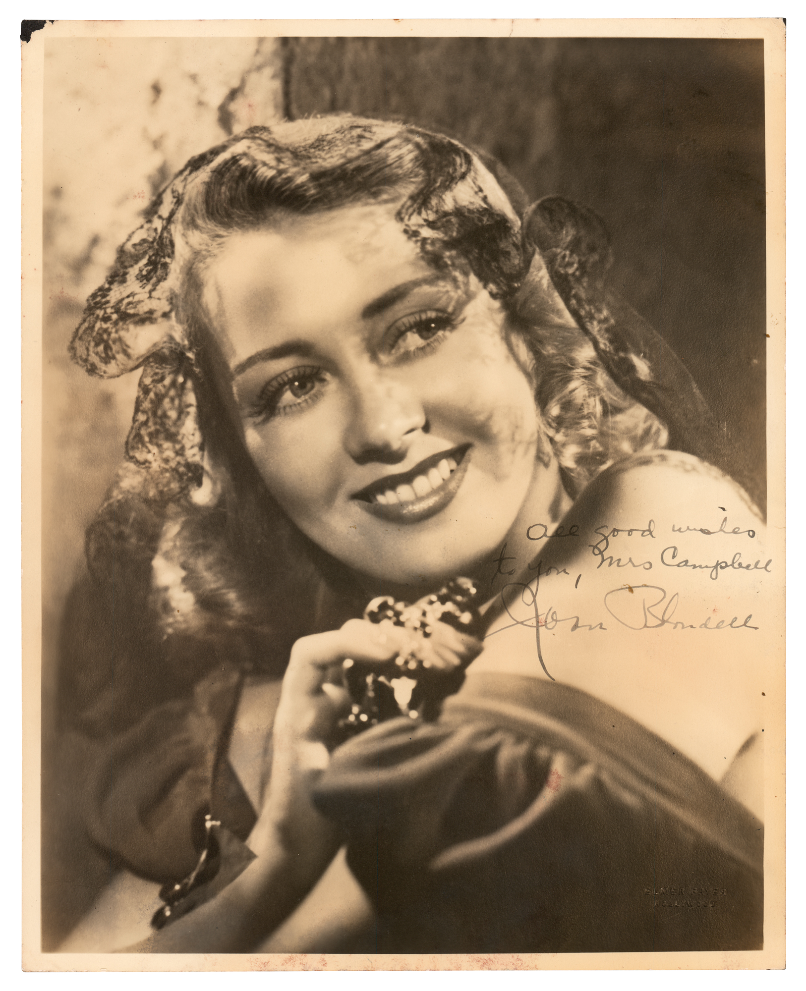Vintage circa 1935/36 matte-finish 8 x 10 studio photo of Blondell with a bright smile and wearing a lace veil and bare-shouldered gown, signed and inscribed in fountain pen, "All good wishes to you, Mrs. Campbell, Joan Blondell.” The lower right corner bears the mark of photographer Elmer Fryer, who worked for Warner Brothers and First National. In fine condition, with mounting remnants to upper corner tips.