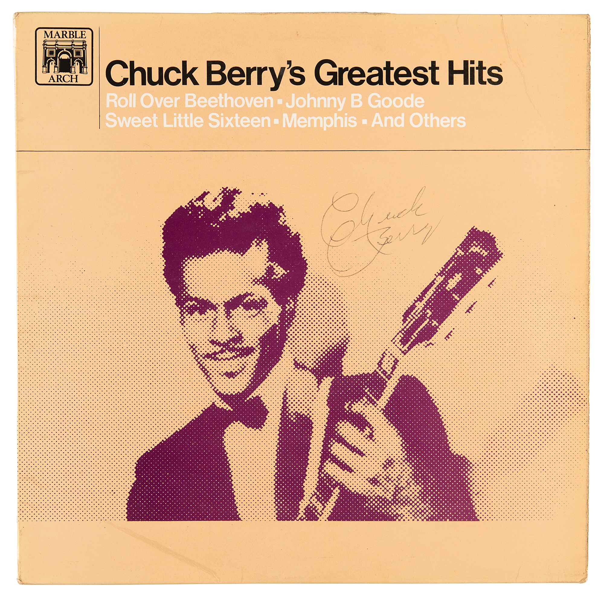 Chuck Berry’s Greatest Hits compilation album signed on the front cover in black ink. In fine condition. The record is not included.
