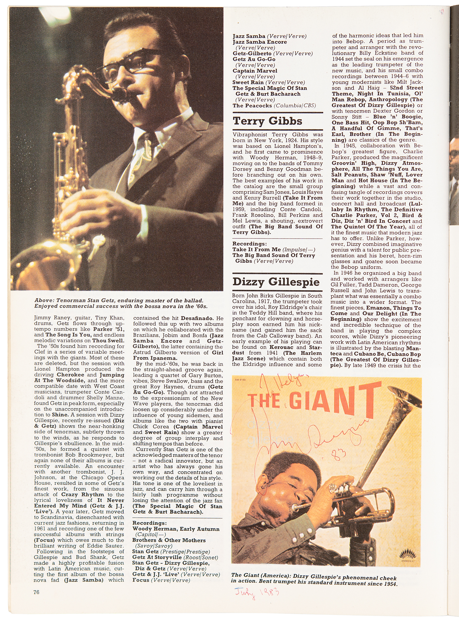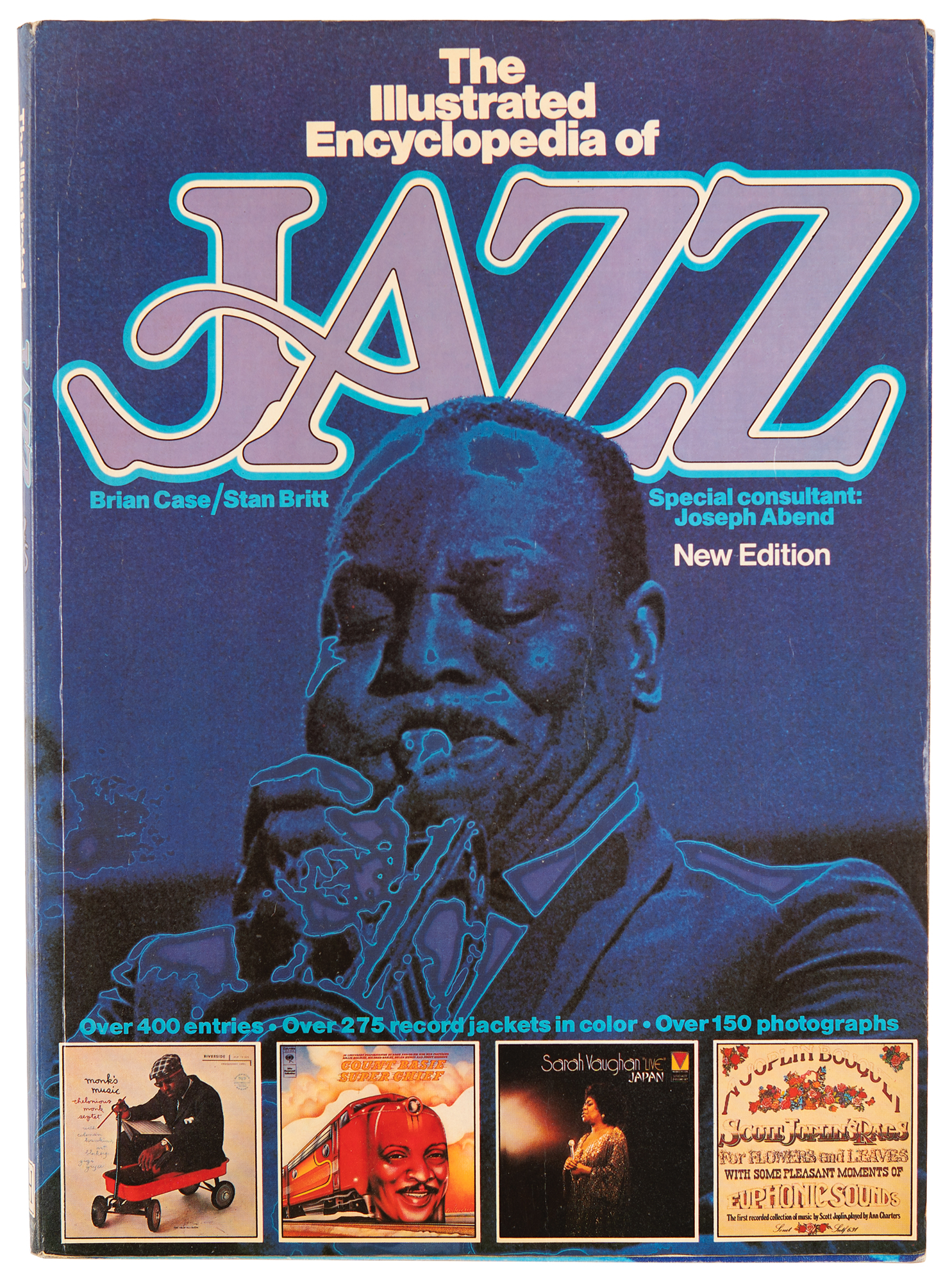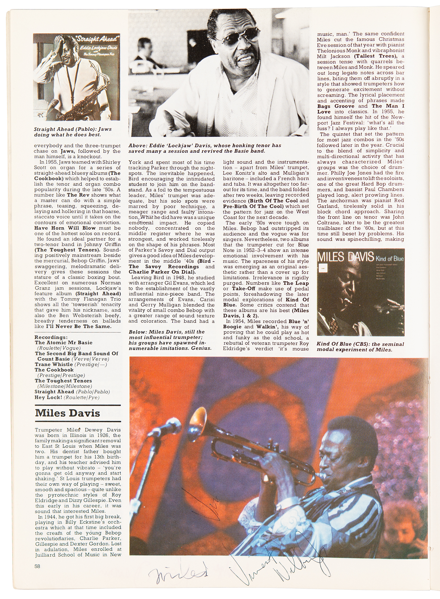 Signed book: The Illustrated Encyclopedia of Jazz. Second impression. NY: Salamander Books, 1979. Softcover, 8.5 x 12, 224 pages. Signed in black ink by Miles Davis below his image at the bottom of page 58, "Miles," and signed and inscribed in red ballpoint by Dizzy Gillespie above his image on page 76, "To Helga, Dizzy Gillespie, '83." The inside covers and inner pages are signed by several other jazz musicians, including Kenny Davern, Jimmy Cobb, George Coleman, Harry Edison, Bobby Hutcherson, Jo Jones, and more. In fine condition, with the covers detached from the textblock.