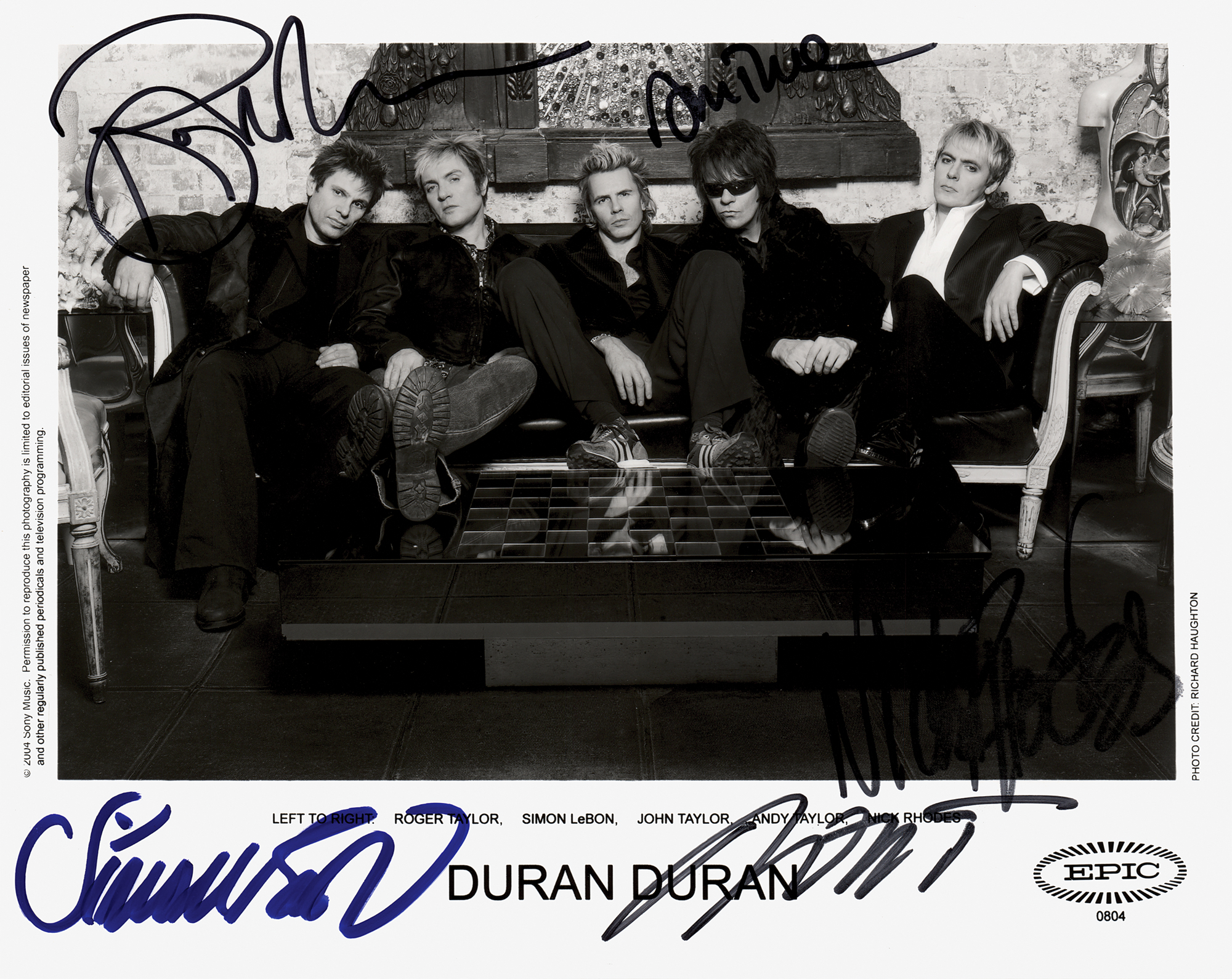 Satin-finish 10 x 8 Epic Records publicity photo of Duran Duran lounging together on a couch, signed in purple felt tip by Simon Le Bon, and in black felt tip by Nick Rhodes, John Taylor, Andy Taylor, and Roger Taylor. In very fine condition.
