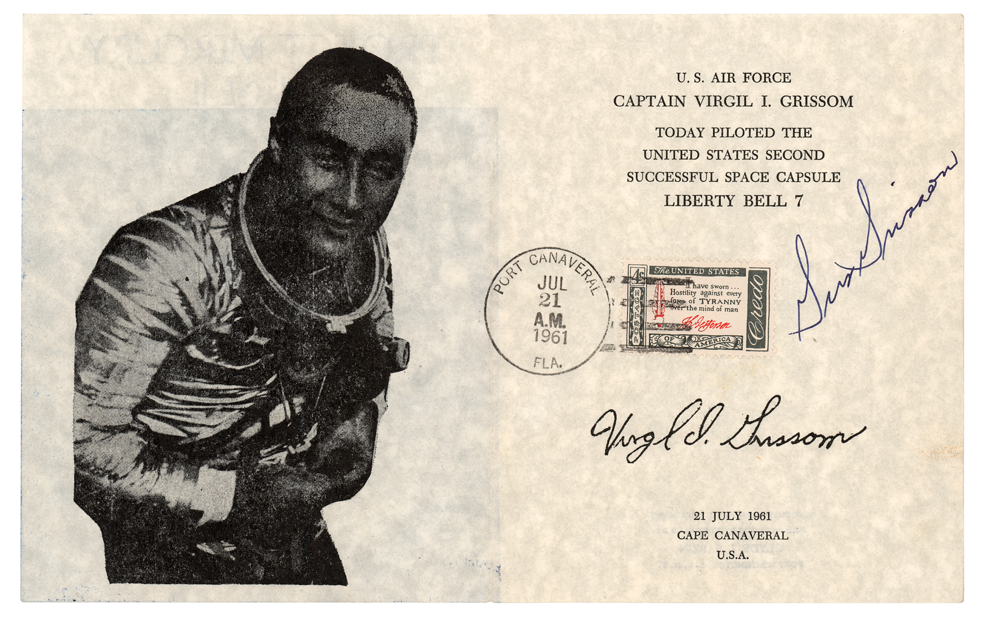 Uncommon “Project Mercury Phase II” philatelic souvenir booklet prepared by Clyde J. Sarzin, measuring 9.5 x 6 open, signed inside in black ink by Gus Grissom. The inside features an image of Grissom and the adjacent page bears his facsimile signature, a 4-cent postage stamp and Port Canaveral cancellation, and printed text: “U.S. Air Force, Captain Virgil I. Grissom, Today Piloted the United States Second Successful Space Capsule, Liberty Bell 7, 21 July 1961, Cape Canaveral, U.S.A.” In fine condition.