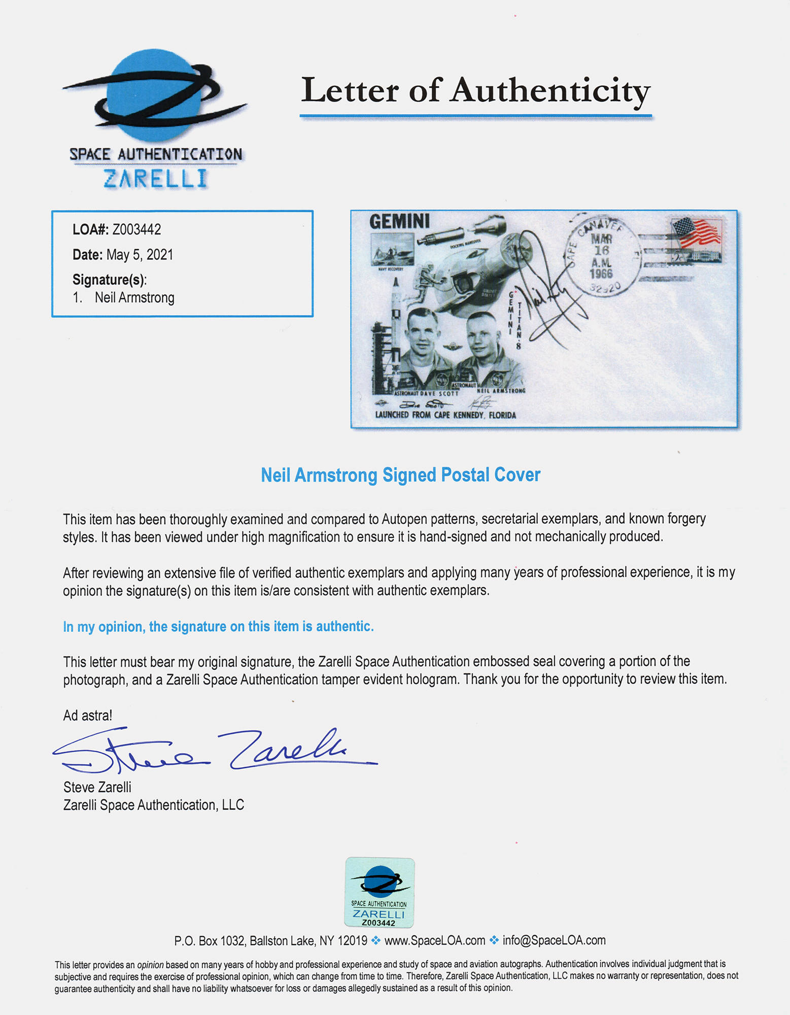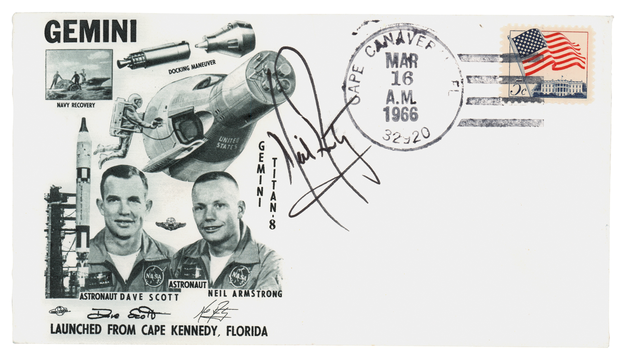 Gemini 8 launch day cover with a cachet honoring the historic mission that saw the first docking of two spacecraft in orbit, postmarked at Cape Canaveral on March 16, 1966, signed in black felt tip by Neil Armstrong. In very fine condition. Accompanied by a full letter of authenticity from Zarelli Space Authentication.