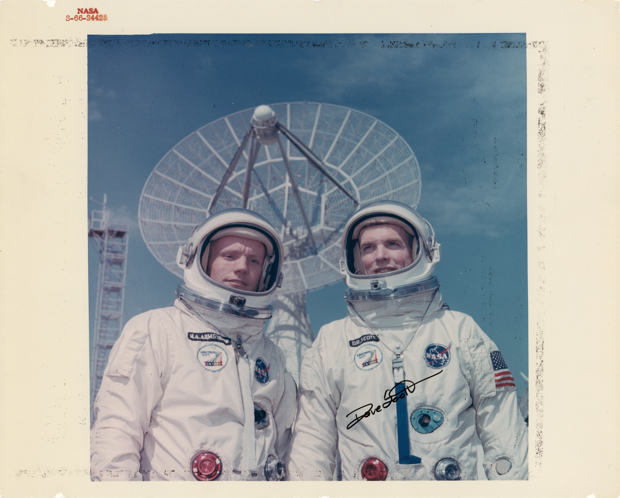 Official color glossy 10 x 8 red-numbered NASA photo (S-66-24425) of Gemini 8 astronauts Neil Armstrong and Dave Scott posing outdoors in their space suits, signed in black ink by Scott. The reverse bears "A Kodak Paper" watermarks. In fine condition, with some staining along the perimeter of the image, and a few small flecks of emulsion loss at the edges.