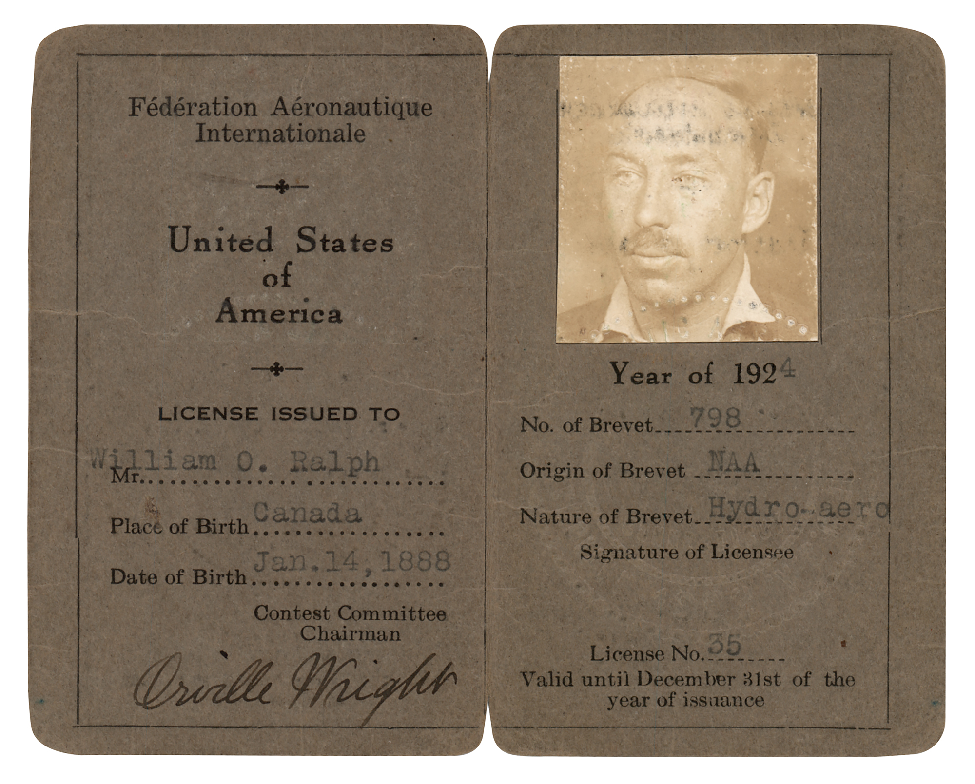 United States of America “Annual License,” number 35, issued to William O. Ralph by the Federation Aeronautique Internationale for the year 1924, two pages, measuring 5 x 4 open, signed at the bottom of the left side by Orville Wright as the contest committee chairman. License is filled out in type, authorizing Young for "Nature of Brevet: Hydro-aero," and bears an affixed 1.5 x 1.5 portrait photo of Ralph. In fine condition, with light handling wear.