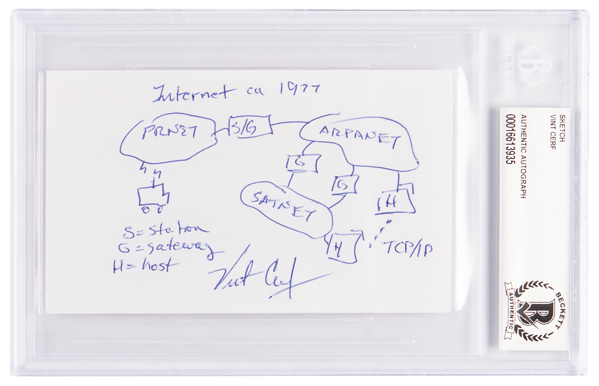 Original sketch by Vint Cerf of the “Internet ca 1977,” accomplished in ballpoint on a white 5 x 3 card, signed at the bottom, "Vint Cerf." The sketch shows a basic diagram of the connections between gateways, hosts, and stations. In very fine condition. Encapsulated in a Beckett authentication holder.