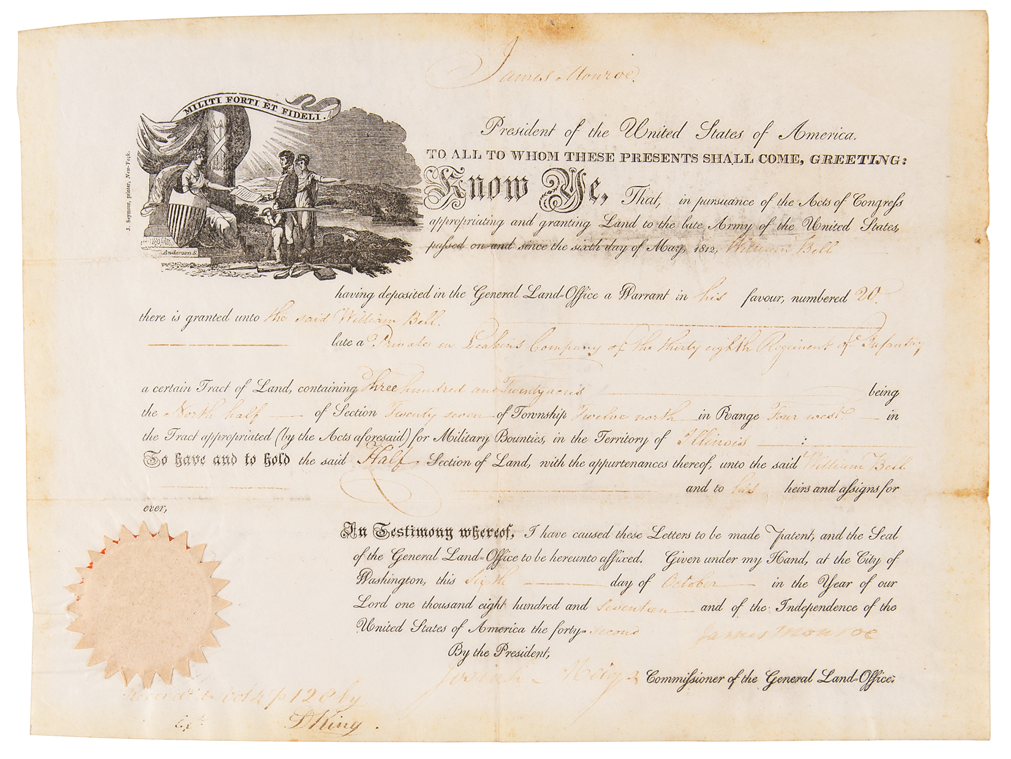 Partly-printed vellum DS as president, one page, 13.25 x 10, October 6, 1817. President Monroe grants William Bell, “late a Private in Peakins Company of the thirty eighth Regiment of Infantry a certain Tract of Land containing Three hundred and Twenty acres…in the Territory of Illinois.” Signed at the conclusion by President James Monroe and countersigned by Commissioner of the General Land Office Josiah Meigs. The beige paper seal remains affixed to the lower left and the reverse bears its uncommon General Land Office tag offering “a Map of the Military Bounty Lands" for a price of one dollar. In very good to fine condition, with staining to the edges, and all handwritten portions (including Monroe's signature) light but legible.