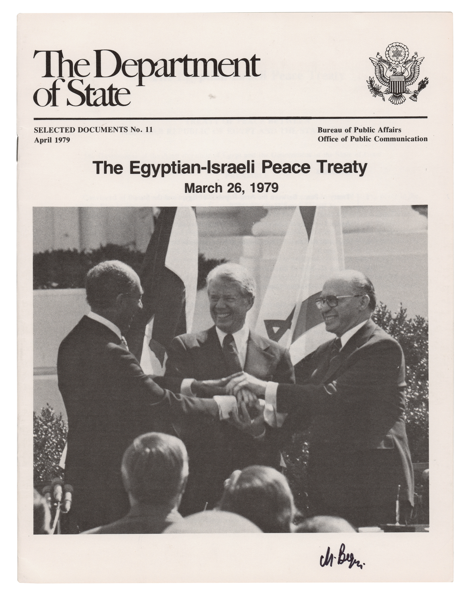 Printed booklet from the U.S. Department of State entitled “The Egyptian-Israeli Peace Treaty, March 26, 1979,” 28 pages, 8 x 10.5, signed by Menachem Begin at the bottom of the front cover in black felt tip, “M. Begin,” who above is pictured joining hands with Egyptian President Anwar Sadat and American President Jimmy Carter. Released by the Bureau of Public Affairs in April 1979, the booklet contains a copy of the full treaty, annexes I through III, a list of agreed minutes, various copies of letters between Carter, Sadat, and Begin, and remarks made by the three leaders after the signing of the treaty. In very fine condition.