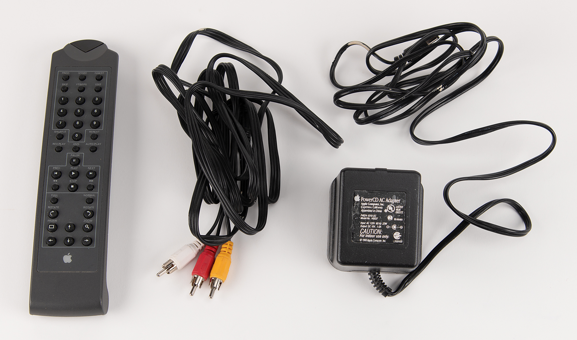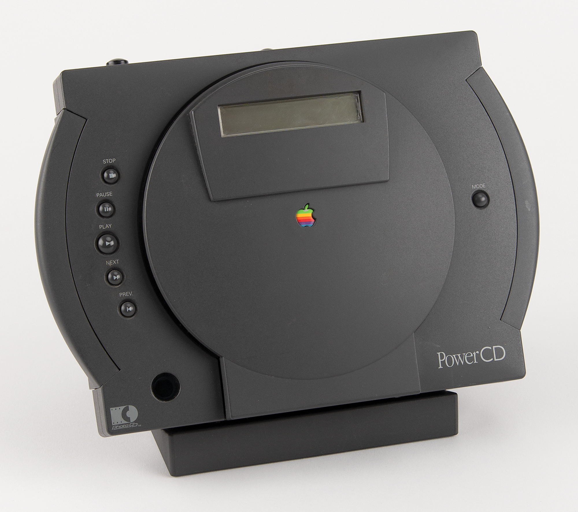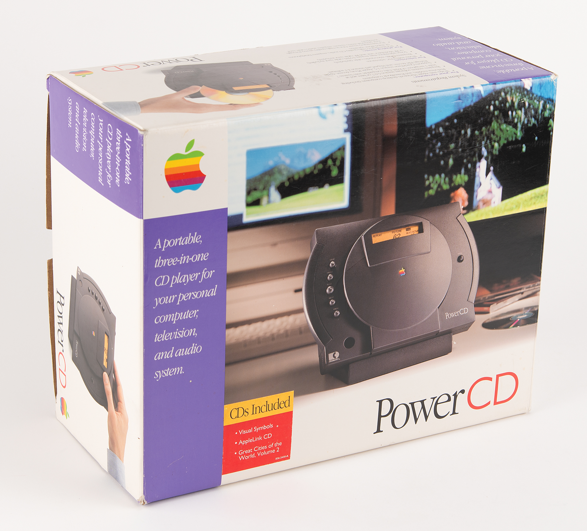 Apple PowerCD player, Part No. H0013LL/A, Serial No. P1326162856A, complete with its original box. Billed as a "three-in-one CD player," the PowerCD worked as a portable CD-ROM drive, could display images from Kodak Photo CDs on a standard television screen, and played music compact discs over stereo speakers or headphones. A metal "Apple Computer, Inc." asset tag is affixed to the rear of the unit. Includes the PowerCD three-in-one player, dock, power cable, remote control, video cable, setup software, CDs, and user's guide. In fine condition.