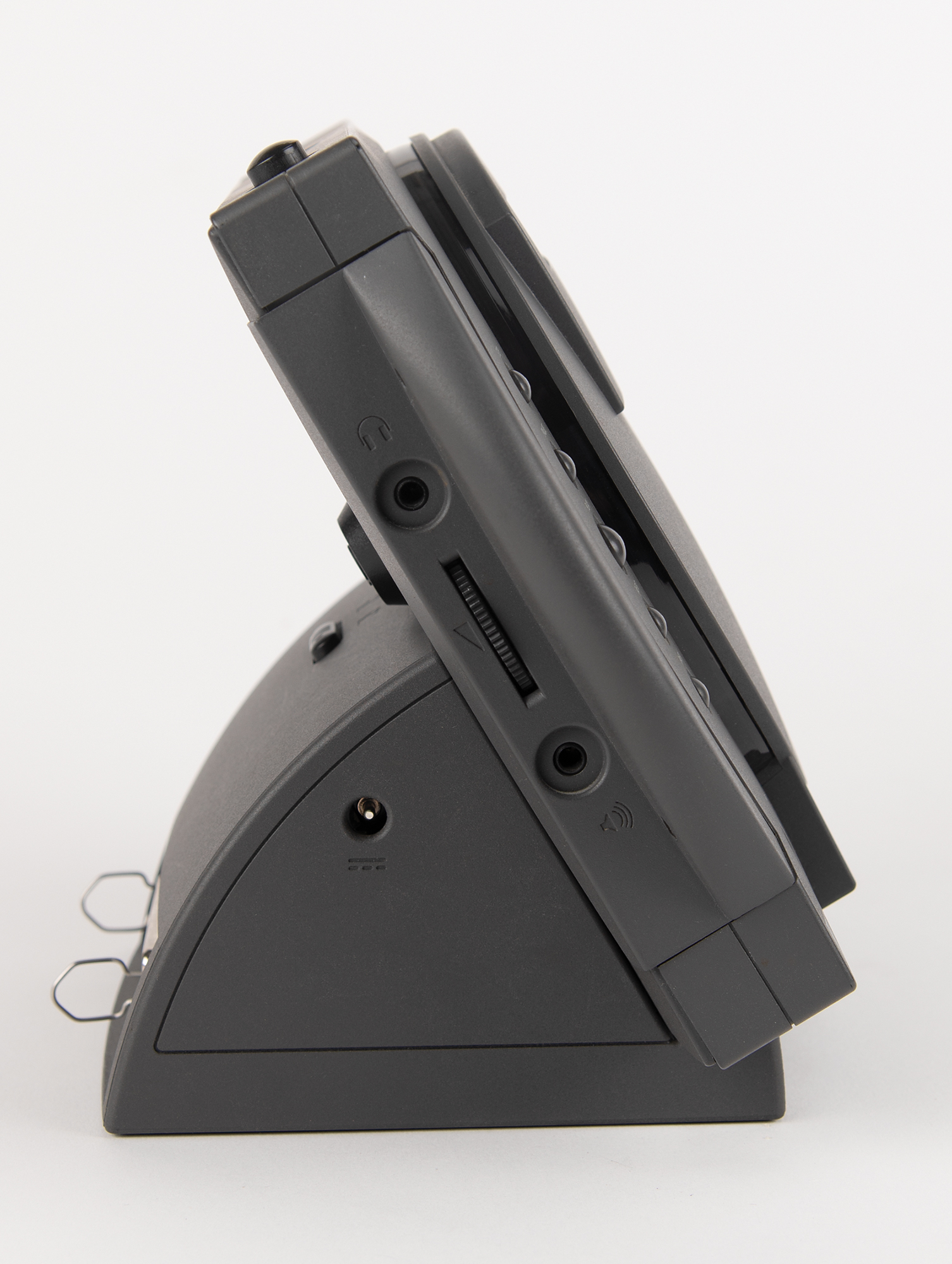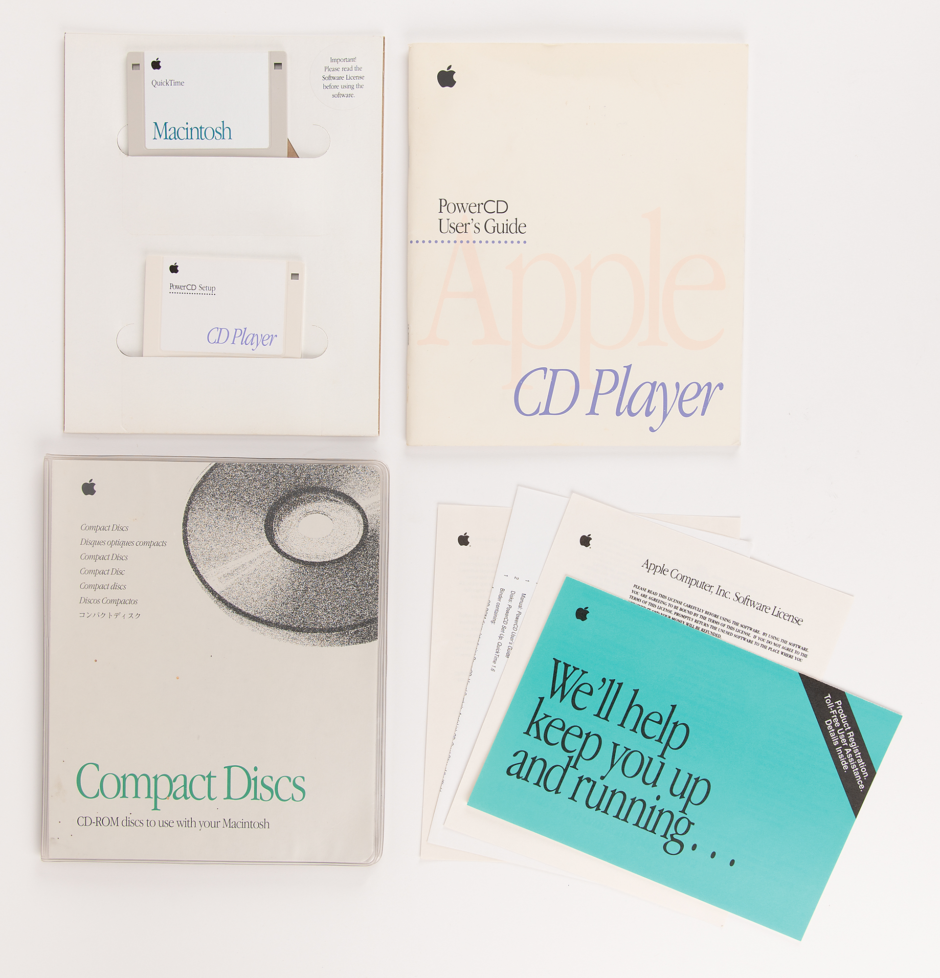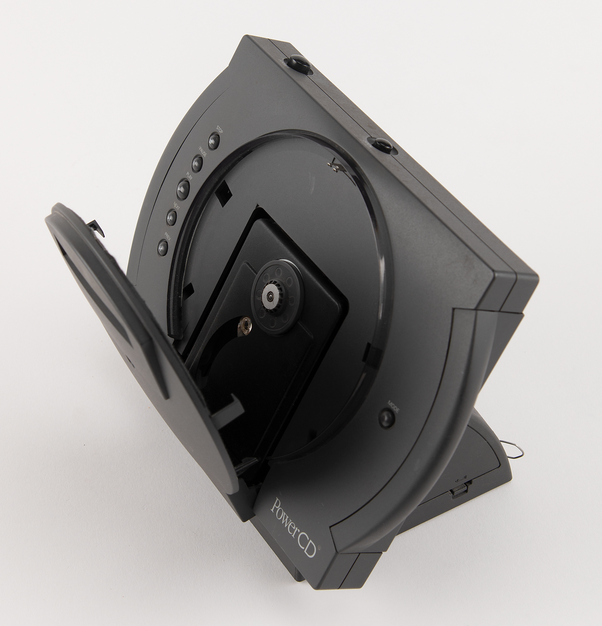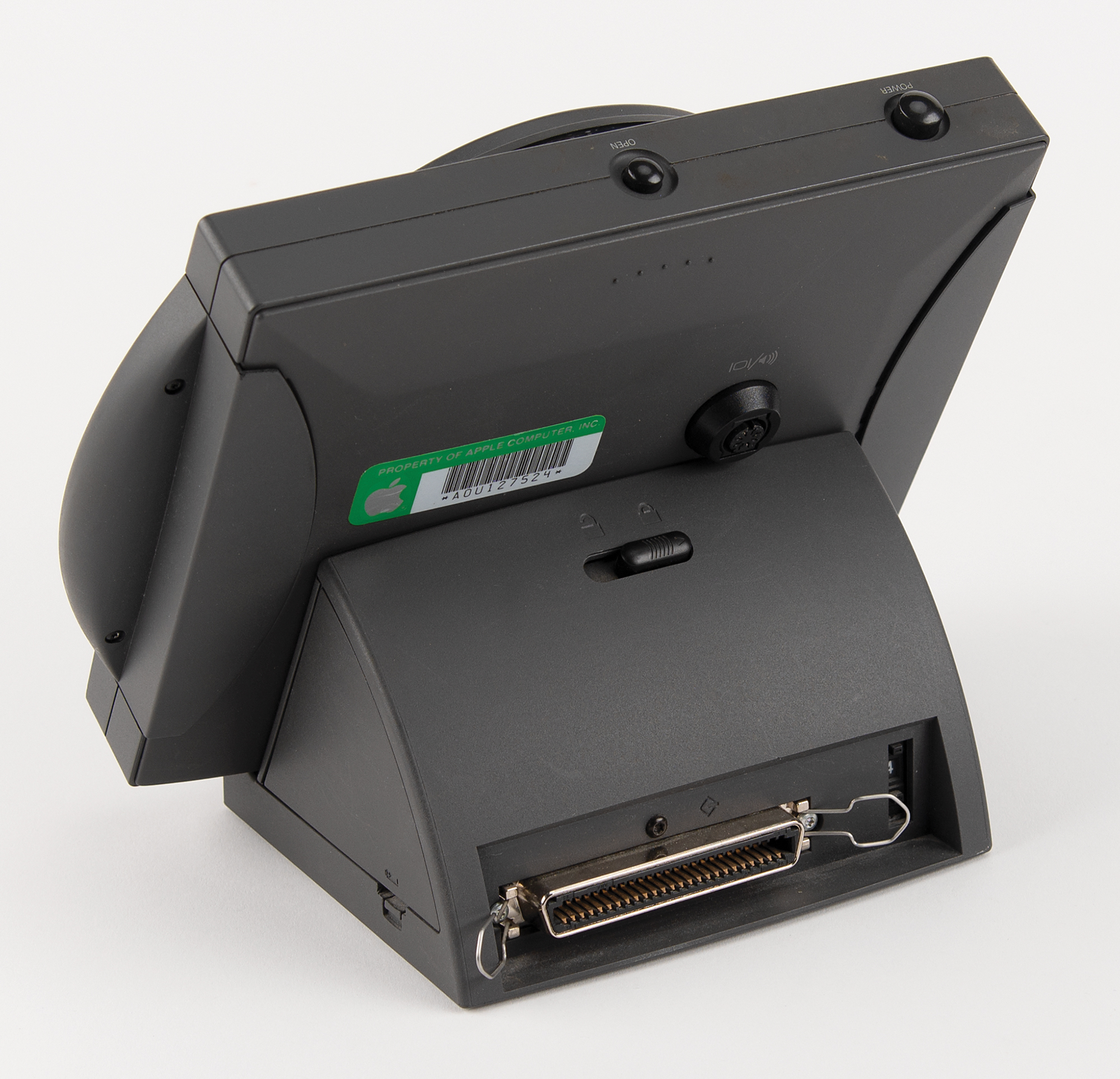 Apple PowerCD player, Part No. H0013LL/A, Serial No. P1326162856A, complete with its original box. Billed as a "three-in-one CD player," the PowerCD worked as a portable CD-ROM drive, could display images from Kodak Photo CDs on a standard television screen, and played music compact discs over stereo speakers or headphones. A metal "Apple Computer, Inc." asset tag is affixed to the rear of the unit. Includes the PowerCD three-in-one player, dock, power cable, remote control, video cable, setup software, CDs, and user's guide. In fine condition.