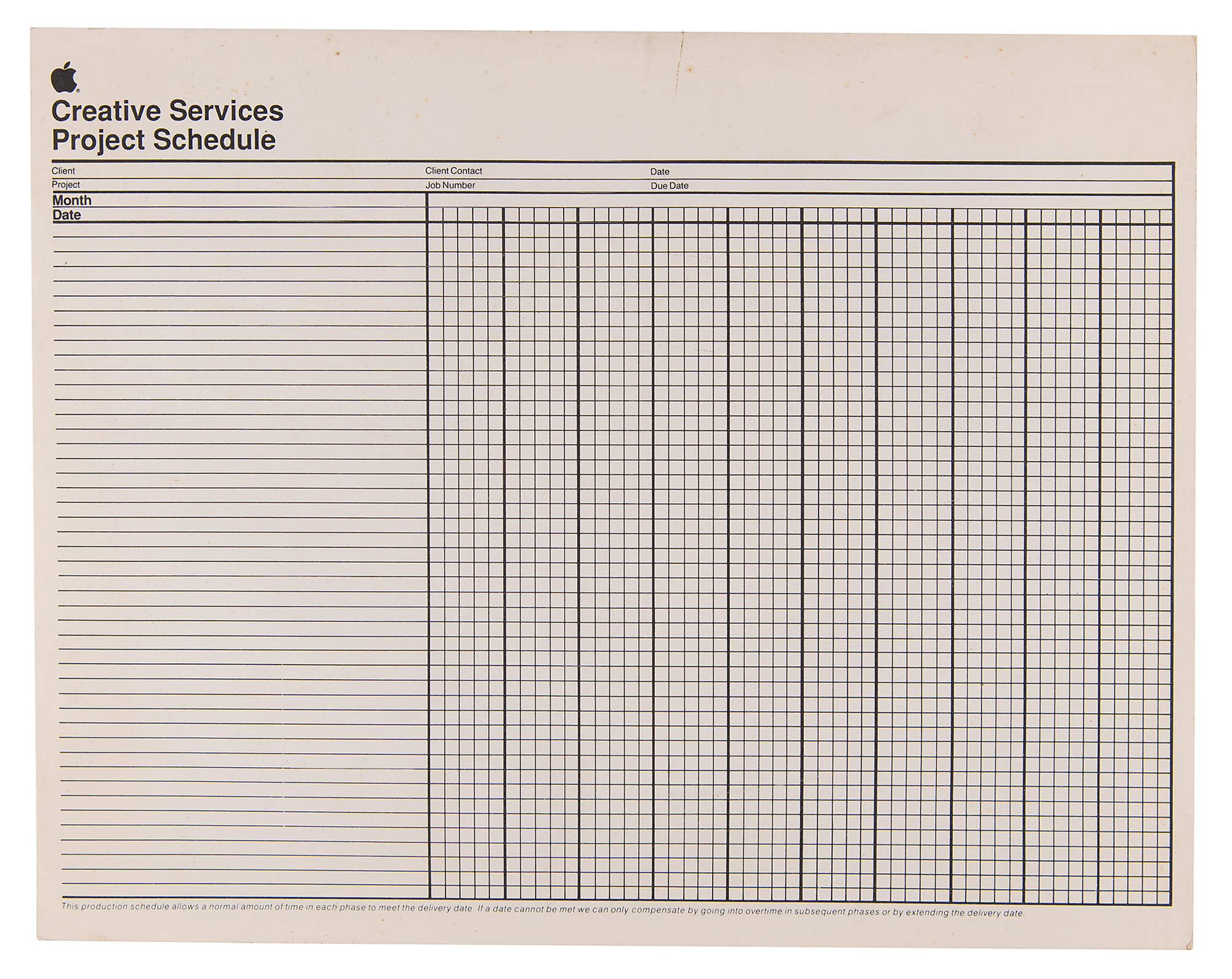 Circa 1980s Apple Computer ‘Creative Services Project Schedule’ Gantt chart booklet, 14 x 11, containing approximately 30 pages used for tracking various project timelines and details. Such documents were integral to the creative and organizational processes during Apple's formative years, providing a glimpse into the company's meticulous planning and execution strategies. In fine condition.