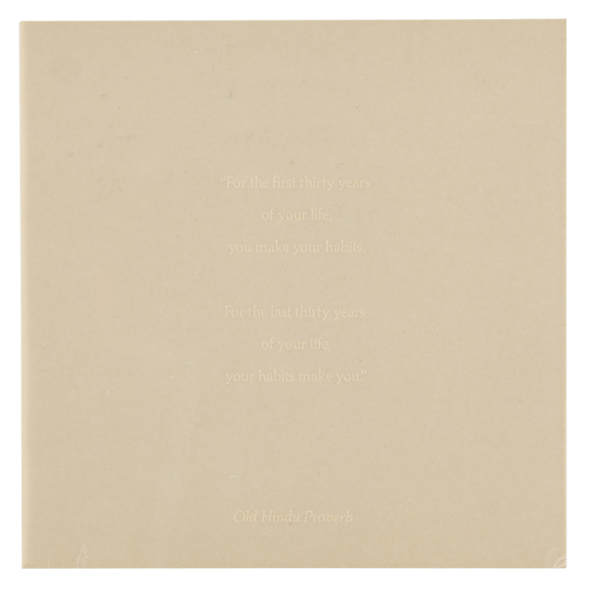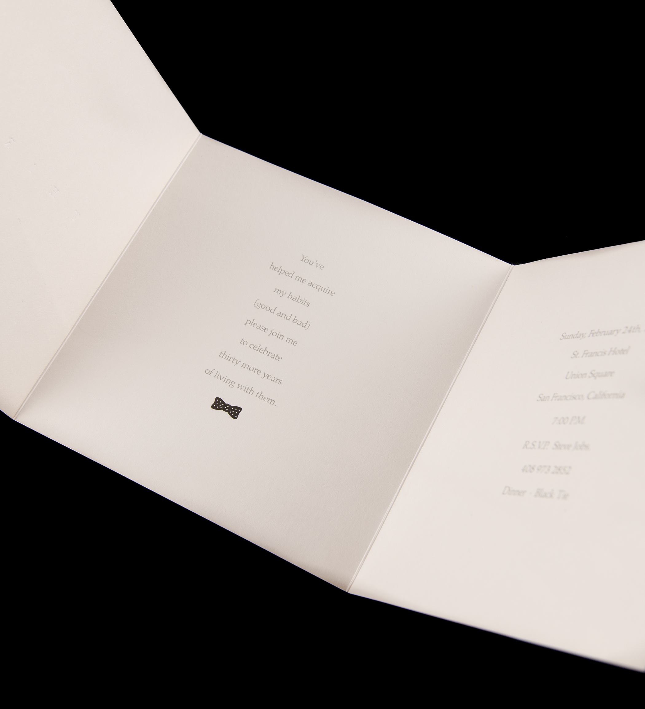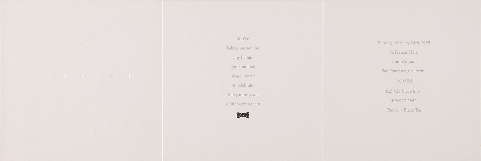 Rare invitation card to Steve Jobs's 30th birthday celebration at the St. Francis Hotel in San Francisco on February 23, 1985, measuring 16.25 x 5.5 open, which features printed text above a small black bow tie with white polka dots: “You've helped me acquire my habits (good and bad) please join me to celebrate thirty more years of living with them.” The adjacent page bears RSP information, and the front cover is embossed “THIRTY!” Includes its original opaque insert printed with an "Old Hindu Proverb,” which reads: “For the first thirty years of your life, you make your habits. For the last thirty years of your life, your habits make you.” In fine condition. Accompanied by its original envelope.