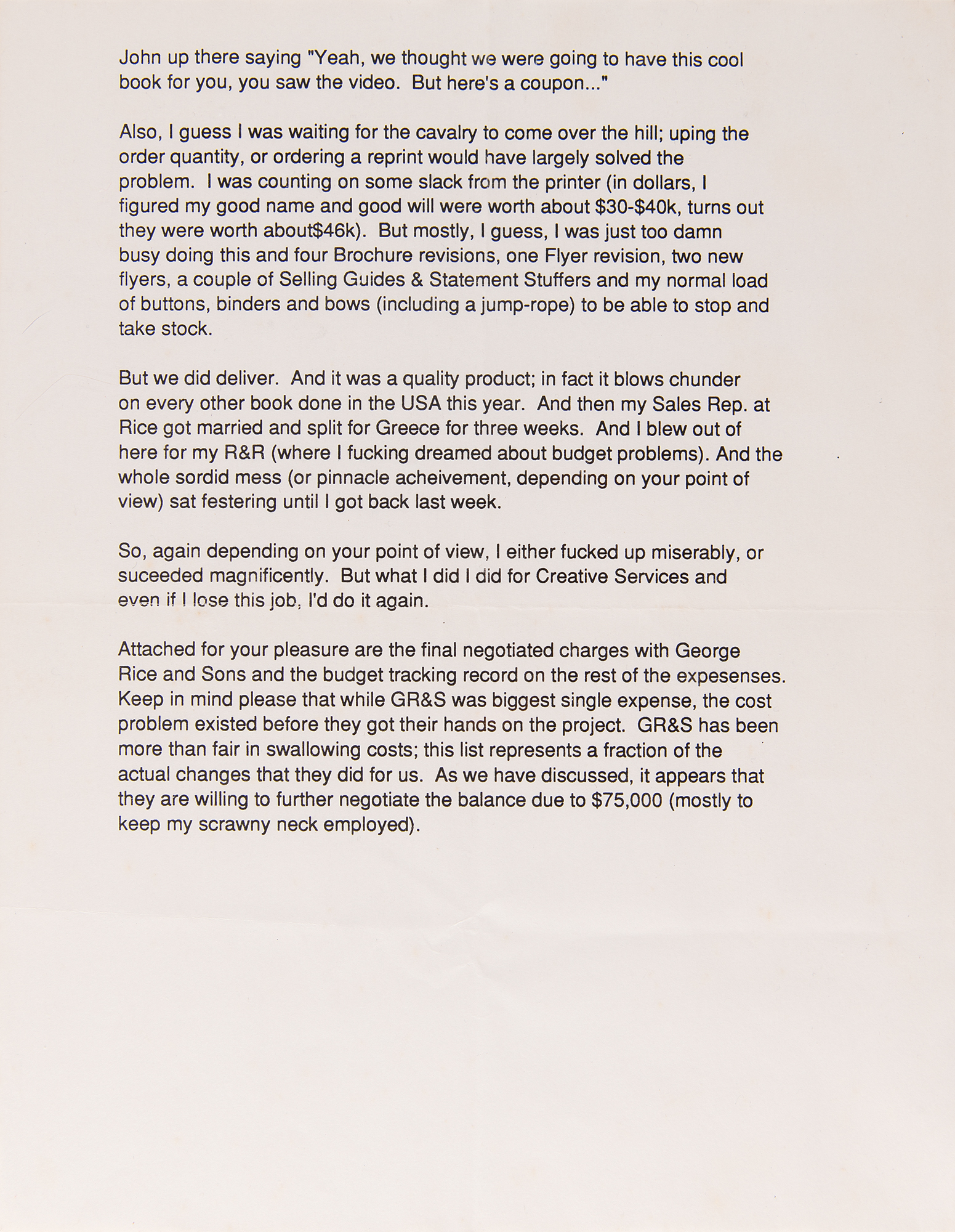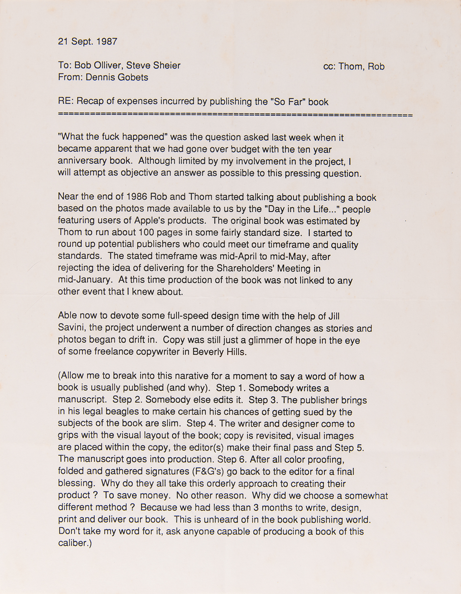Fascinating group lot of items related to the production of the 1987 book So Far: The First Ten Years of a Vision, which was published to commemorate the company’s 10th anniversary. The lot includes a bracket-bound 66-page working typescript of the book, with the front cover marked "X" in red felt tip; a hardcover first edition sealed in its original cellophane wrapper; and a printed copy of a typed letter from Apple production manager Dennis Gobets, dated September 21, 1987, with the memo title “Recap of expenses incurred by publishing the ‘So Far’ book," which begins with a quote from an irate Steve Jobs: “What the fuck happened.”