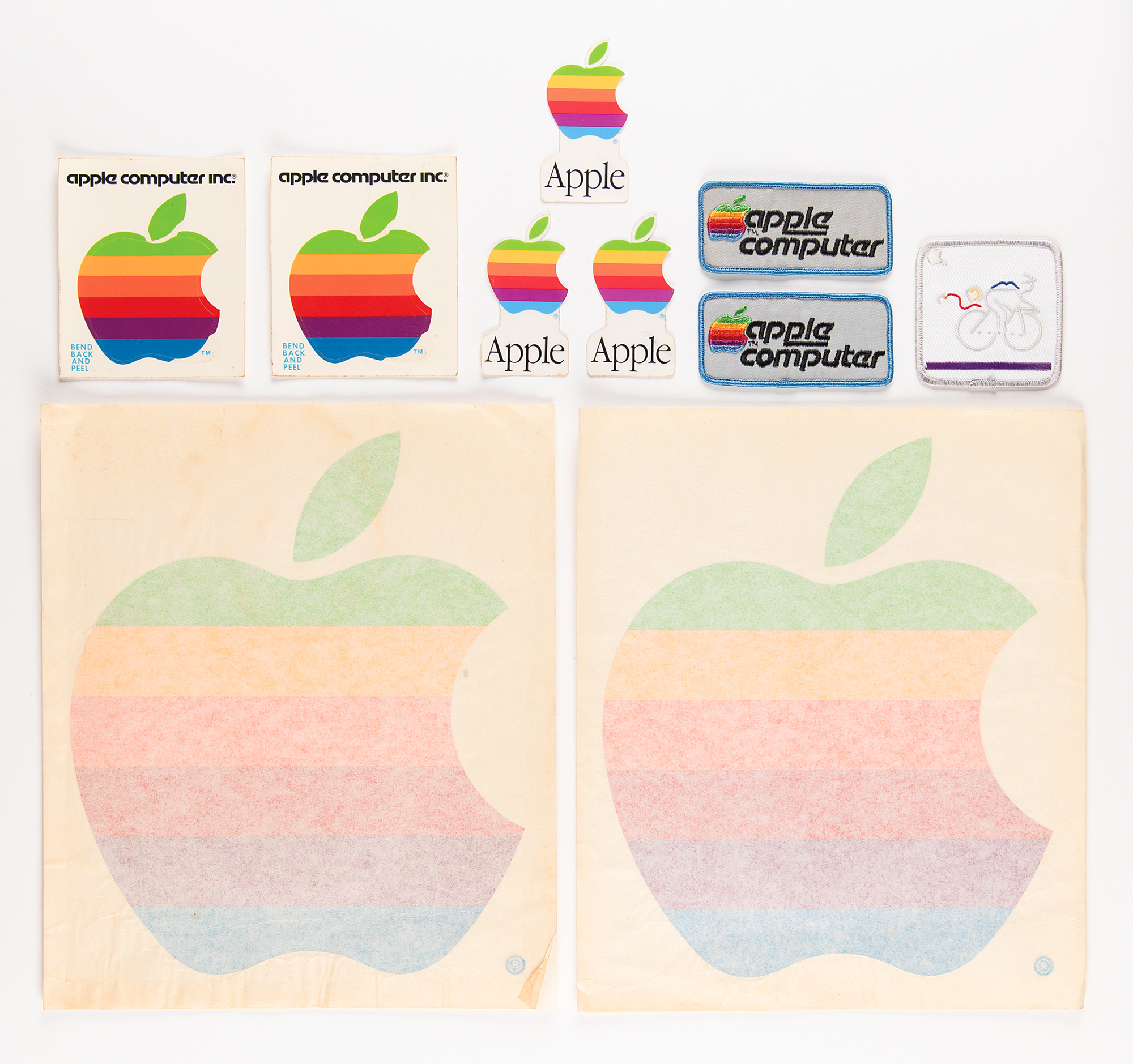 Small collection of 10 stickers and patches from Apple Computer, including seven stickers, ranging in size from 2 x 3.5 to 11 x 13, each featuring the iconic Apple ‘rainbow’ logo, and three embroidered patches, measuring 3.25 x 3.25 and 4 x 2, with two reading “Apple Computer” with the rainbow logo, and one of a student riding a bike with a Macintosh computer, a design created during the company's push into the education market in 1988. In overall fine condition, with some light wear.