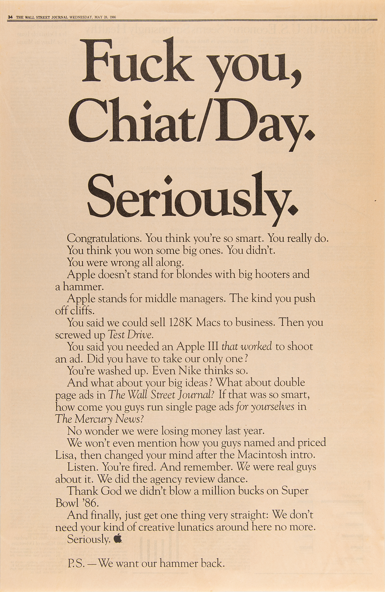 Extremely rare parody full-page Wall Street Journal newspaper advertisement printed by the Creative Services department of Apple Computer, with the bold uncensored headline, “Fuck you, Chiat/Day. Seriously.,” an in-house spoof printed as an acerbic alternative to Steve Jobs’s gracious full-page ‘thank you’ letter to the New York City advertising agency following Apple’s dismissal of the company on May 27, 1986. Jobs, then no longer with Apple, had his letter printed in The Wall Street Journal on the same day. It featured the famous headline: “Congratulations, Chiat/Day. Seriously.”