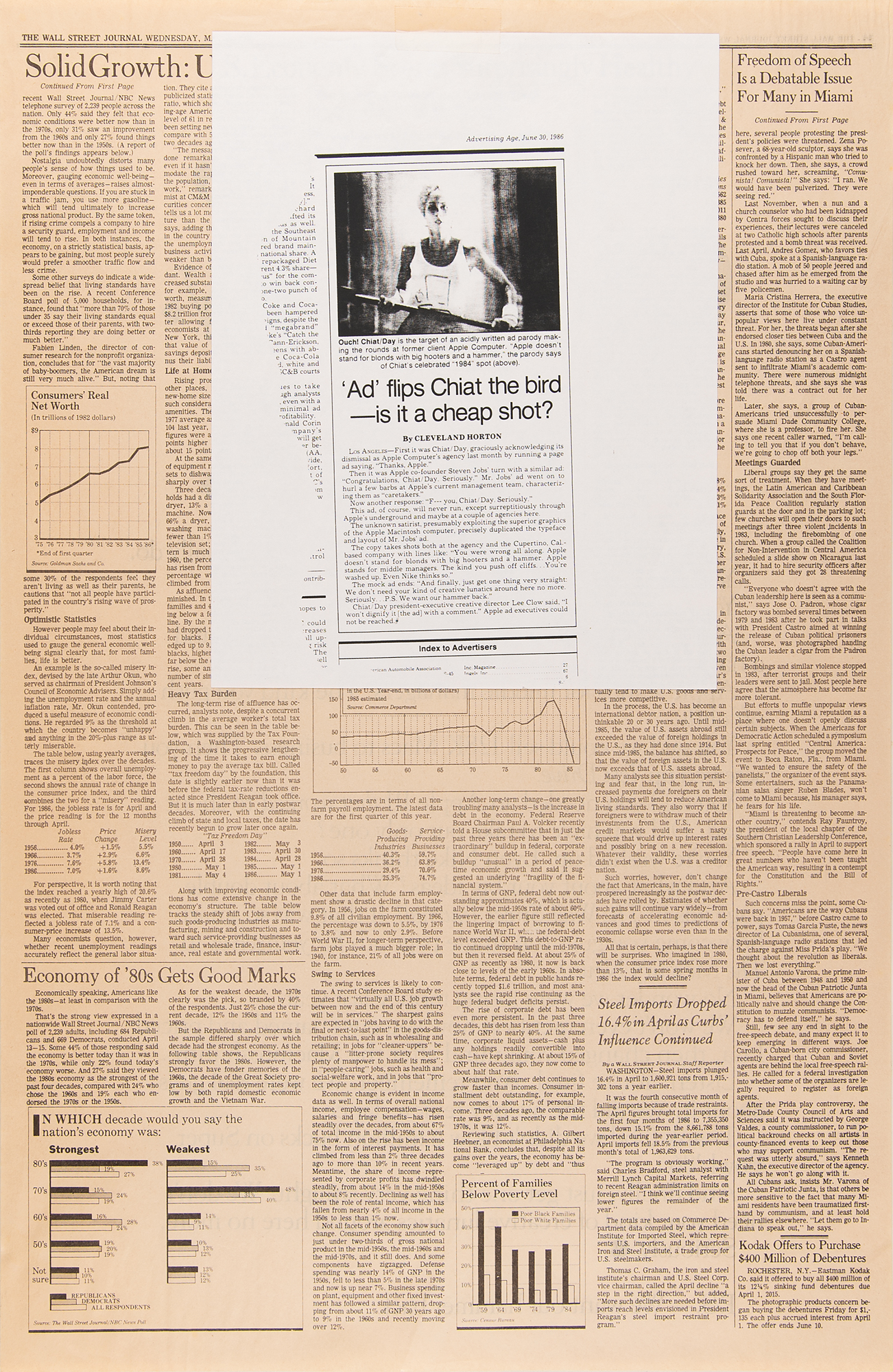 The realistic full-page ad, 15 x 23, reads, in full: “Congratulations. You think you're so smart. You really do. You think you won some big ones. You didn't. You were wrong all along. Apple doesn't stand for blondes with big hooters and a hammer. Apple stands for middle managers. The kind you push off cliffs. You said we could sell 128K Macs to business. Then you screwed up Test Drive. You said you needed an Apple III that worked to shoot an ad. Did you have to take our only one? You're washed up. Even Nike thinks so. And what about your big ideas? What about double page ads in The Wall Street Journal? If that was so smart, how come you guys run single page ads for yourselves in The Mercury News? No wonder we were losing money last year. We won't even mention how you guys named and priced Lisa, then changed your mind after the Macintosh intro. changed Listen. You're fired. And remember. We were real guys about it. We did the agency review dance. Thank God we didn't blow a million bucks on Super Bowl '86. And finally, just get one thing very straight: We don't need your kind of creative lunatics around here no more. Seriously. P.S. We want our hammer back.” The reverse of the page, which contains actual articles printed in the May 28, 1986 issue of The Wall Street Journal, bears an affixed photocopy of an Advertising Age article from June 30, 1986, which covers the spoof article’s leak and bears the headline, “‘Ad’ flips Chiat the bird – is it a cheap shot?” In fine condition. The consignor notes that several of these full-page ads were surreptitiously printed and placed into Wall Street Journal newspapers for Apple employees to discover.