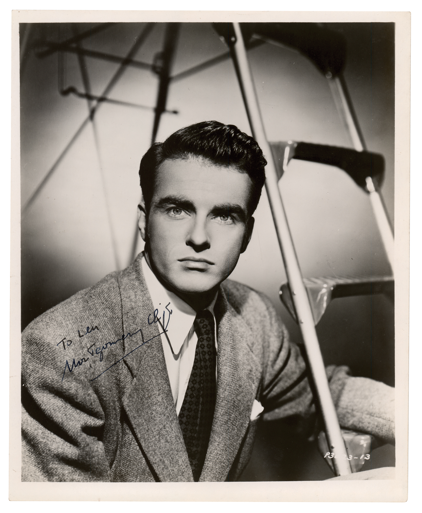 Vintage circa 1950 glossy 8 x 10 studio portrait photo of Montgomery Clift posing under a ladder, signed and inscribed in bold fountain pen, "To Len, Montgomery Clift.” In fine condition.