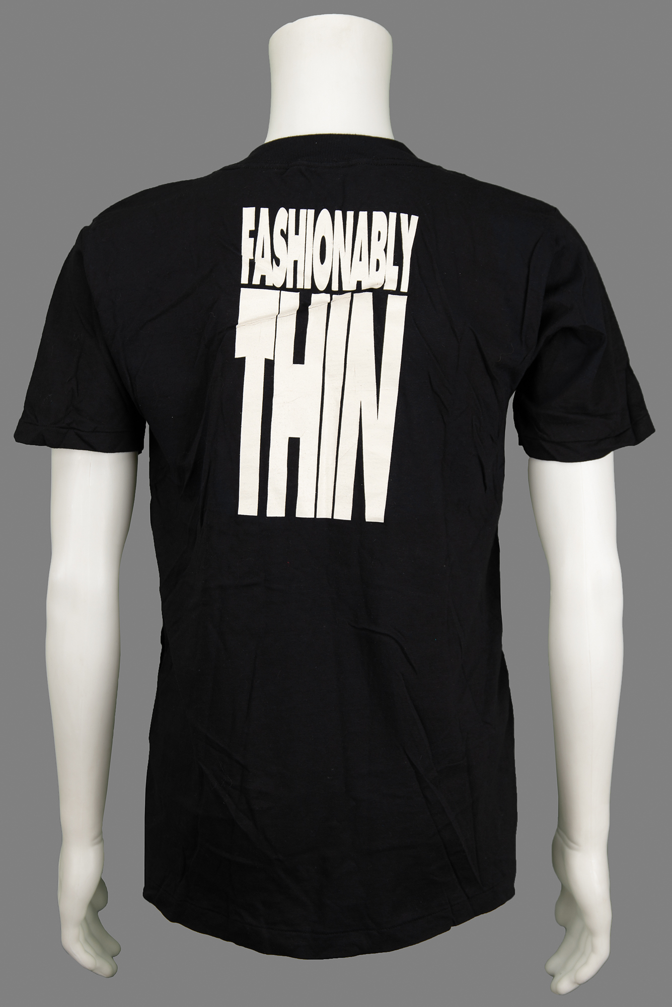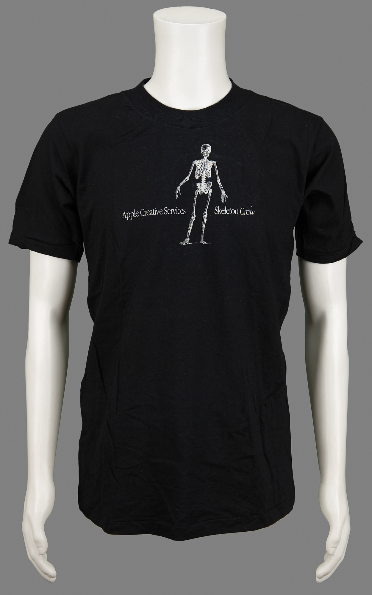 Uncommon black Apple Computer t-shirt for the Creative Services department, size large, featuring a front design of a human skeleton standing between white text: “Apple Creative Services” and “Skeleton Crew.” The back of the shirt features large white lettering: “Fashionably Thin.” In fine condition.