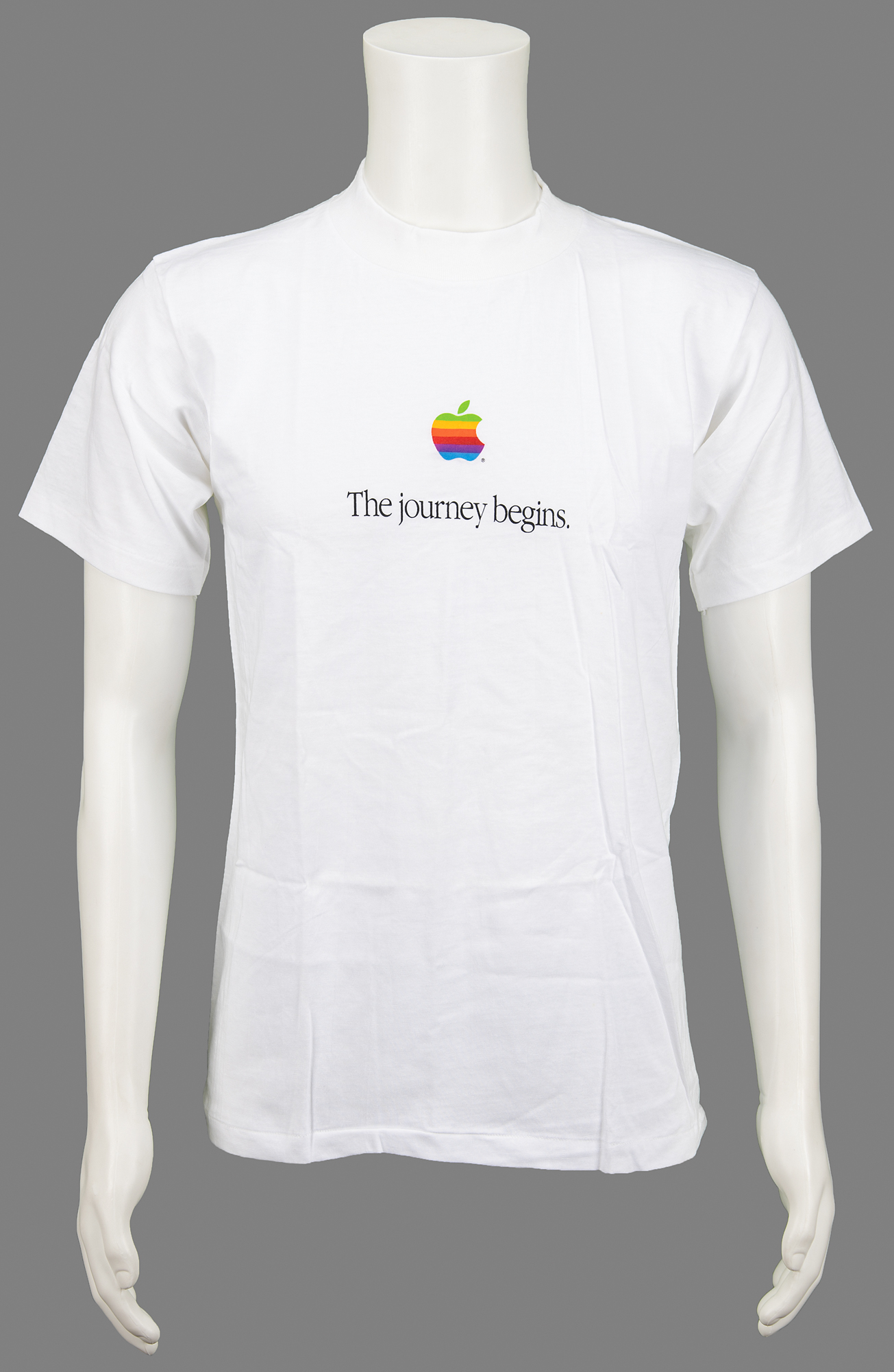 Attractive white Apple Computer t-shirt gifted to new employees during orientation, size medium, with the front featuring a design of the iconic Apple ‘rainbow’ logo above black text: “The journey begins.” In very fine, never-worn condition.