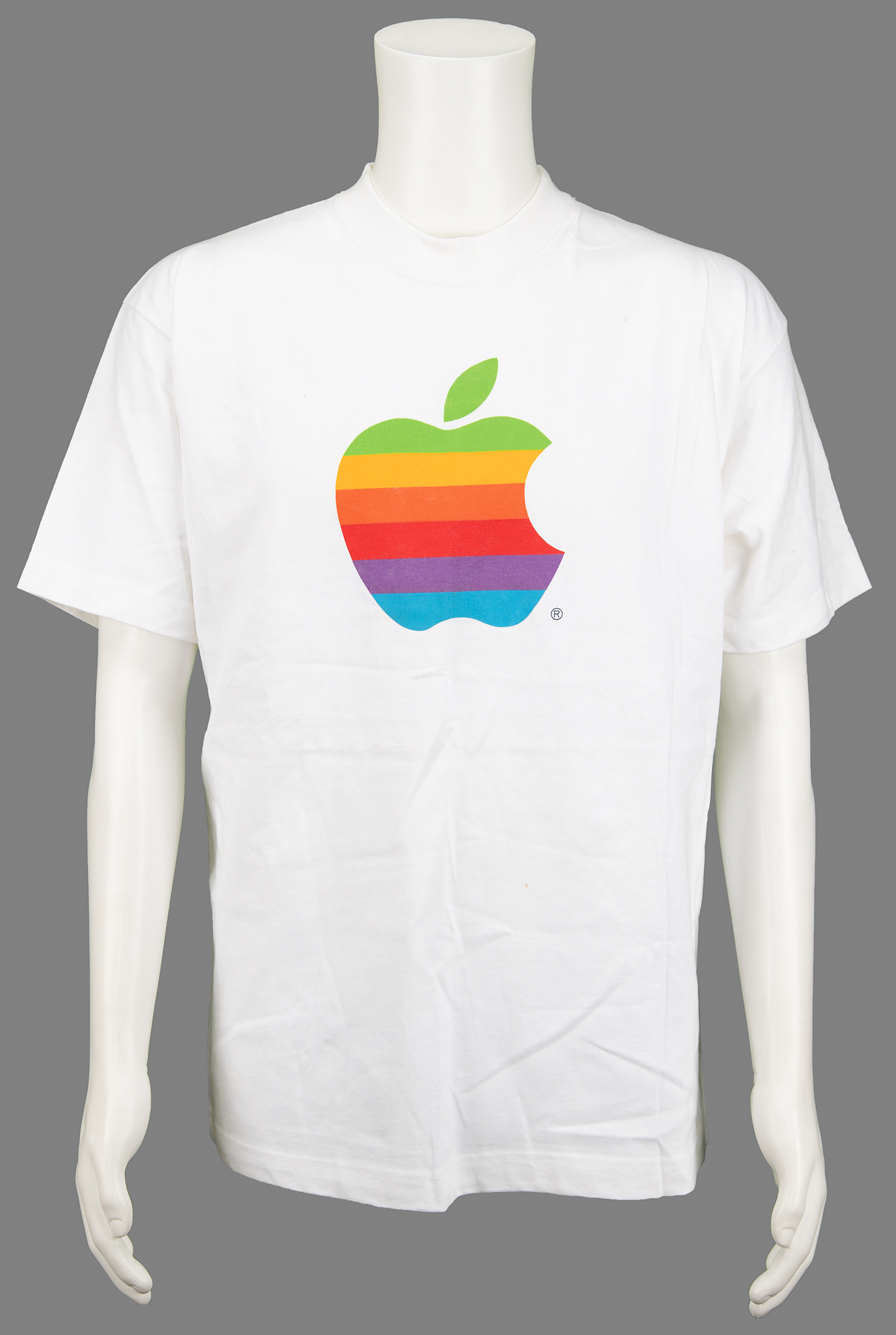 White Apple Computer t-shirt gifted to new employees in the 1980s, no size (likely extra large), with the front featuring a large design of the iconic Apple ‘rainbow’ logo with a small registered trademark symbol. A label marked “7546” is affixed to the inner collar area. In fine condition.