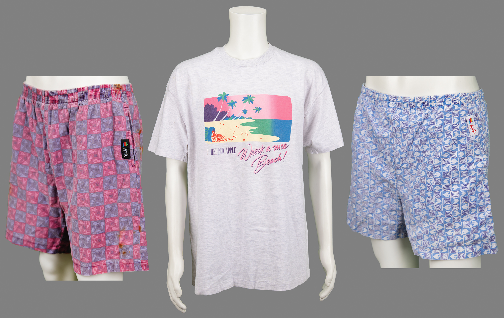 Attractive set of beach-inspired Apple Computer clothing: an extra large gray t-shirt with the front featuring the stylized text, “I Helped Apple Wreck a Nice Beach!,” below a beach scene with a tipped trash can spilling apple cores across the sand, and the back showing a cartoon computer with smiley face and ears below ‘corrected’ text: “I Helped Apple Recognize Speech!”; a pair of blue Apple Computer bathing suit shorts, size large; and a pair of purple Apple Computer beach shorts, size extra large. Both shorts feature the iconic Apple ‘rainbow’ logo tag to the left pocket. In overall very good to fine condition, with stains to the shorts.
