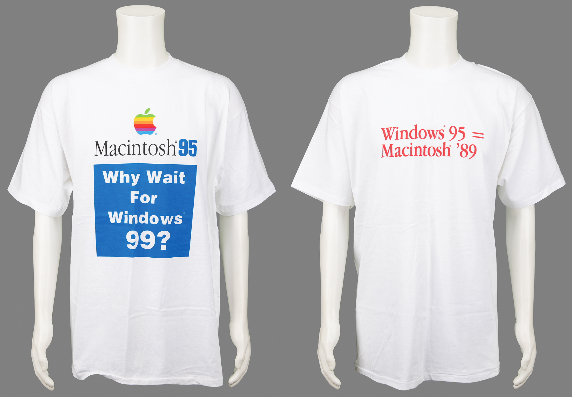 Two white Apple Computer shirts made in response to Microsoft’s introduction of Windows 95, both extra large, with one featuring red text to the front, “Windows 95 = Macintosh ‘89,” and the other shirt features the iconic Apple ‘rainbow’ logo above text, “Macintosh 95, Why Wait for Windows 99?” In overall fine condition.