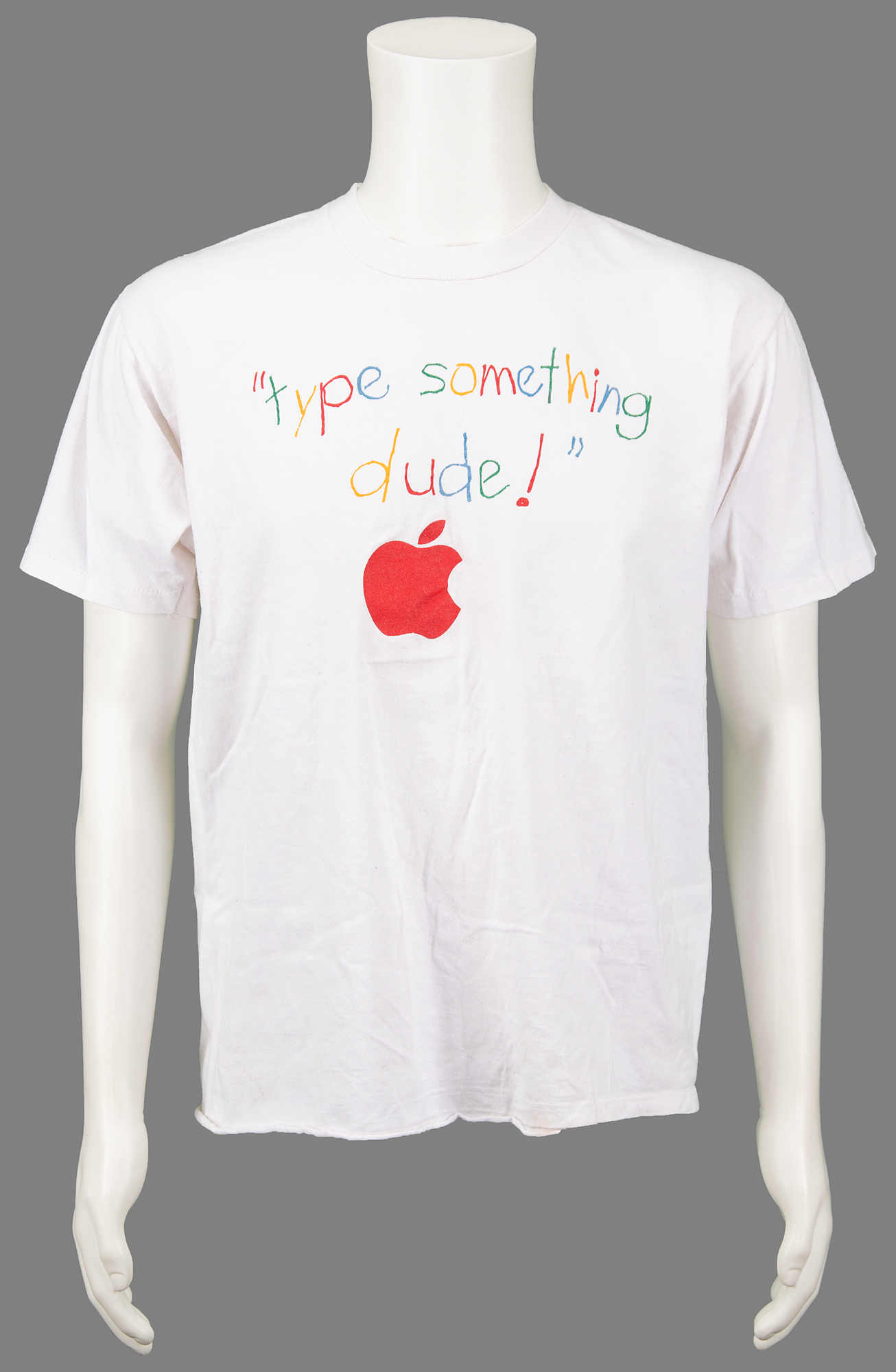 White Apple Computer t-shirt, size extra large, with the front featuring a red Apple logo below multicolored children’s lettering: “‘type something dude!’” In fine condition.