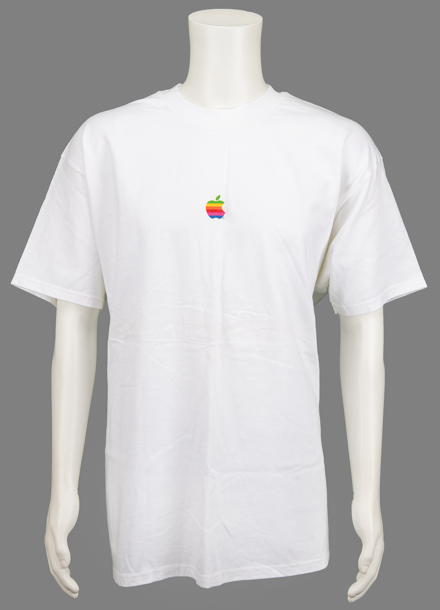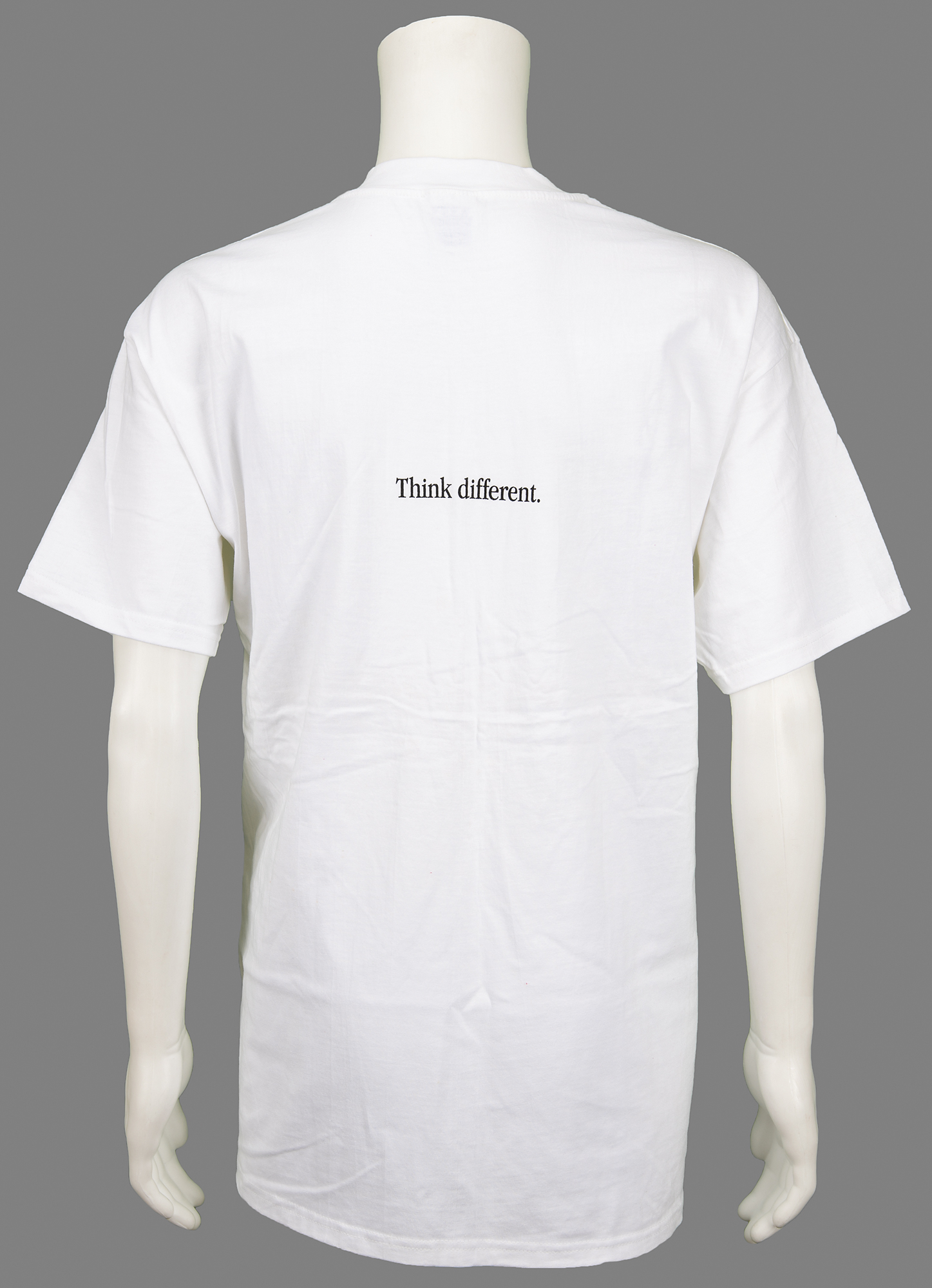 Bright white Apple Computer t-shirt, size extra large, with the front featuring a small Apple ‘rainbow’ logo, and the back bearing simple black text: “Think different.” In fine condition.From the collection of Dennis Gobets.