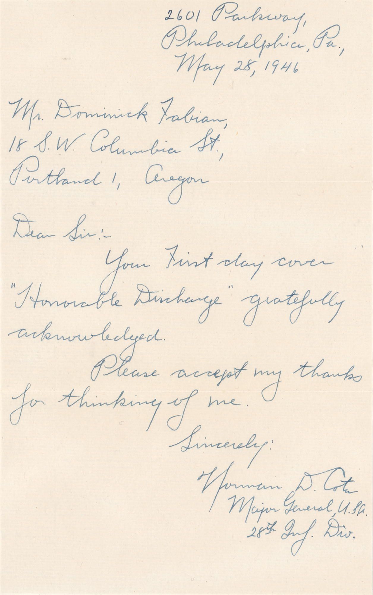 Senior U.S. Army officer (1893-1971) who fought during World War II and was heavily involved in the planning and execution of the Allied invasion of Normandy in June 1944. He is known for rallying demoralized troops on Omaha Beach on D-Day, by engaging in combat beside them and personally leading their first successful breakout, for which he was awarded the Distinguished Service Cross. Uncommon ALS signed “Norman D. Cota, Major General, U.S.A., 28th Inf. Div.,” one page, 5.75 x 9, May 28, 1946. Handwritten letter to collector Dominick Fabian, in full: “Your first day cover ‘Honorable Discharge’ gratefully acknowledged. Please accept my thanks for thinking of me.” In fine condition. Accompanied by the original mailing envelope hand-addressed by Cota, who incorporates his signature into the return address field.