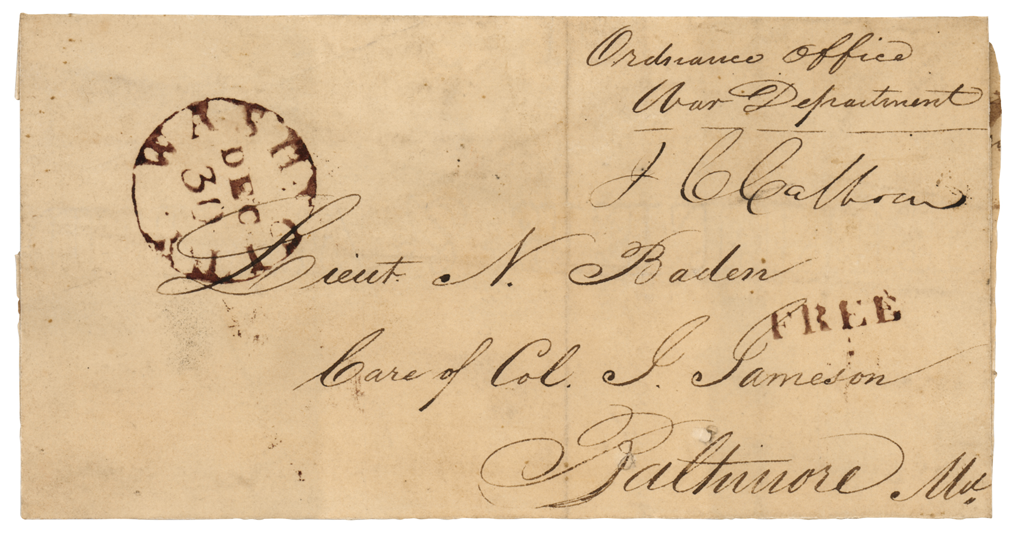 Prominent American politician (1782–1850) who served as vice president under John Quincy Adams and Andrew Jackson. He later wielded great power and influence in the Senate as a champion of Southern causes, including slavery. Mailing envelope, 6.25 x 3.25, December 30, 1823, addressed in another hand to "Lieut. N. Baden, Care of Col. J. Jameson, Baltimore, Md.,” indicated as being sent from the “Ordinance Office, War Department,” and signed below with a crisp franking signature, “J. C. Calhoun.” The envelope is stamped below, “Free.” In fine condition, with some light creasing and soiling.