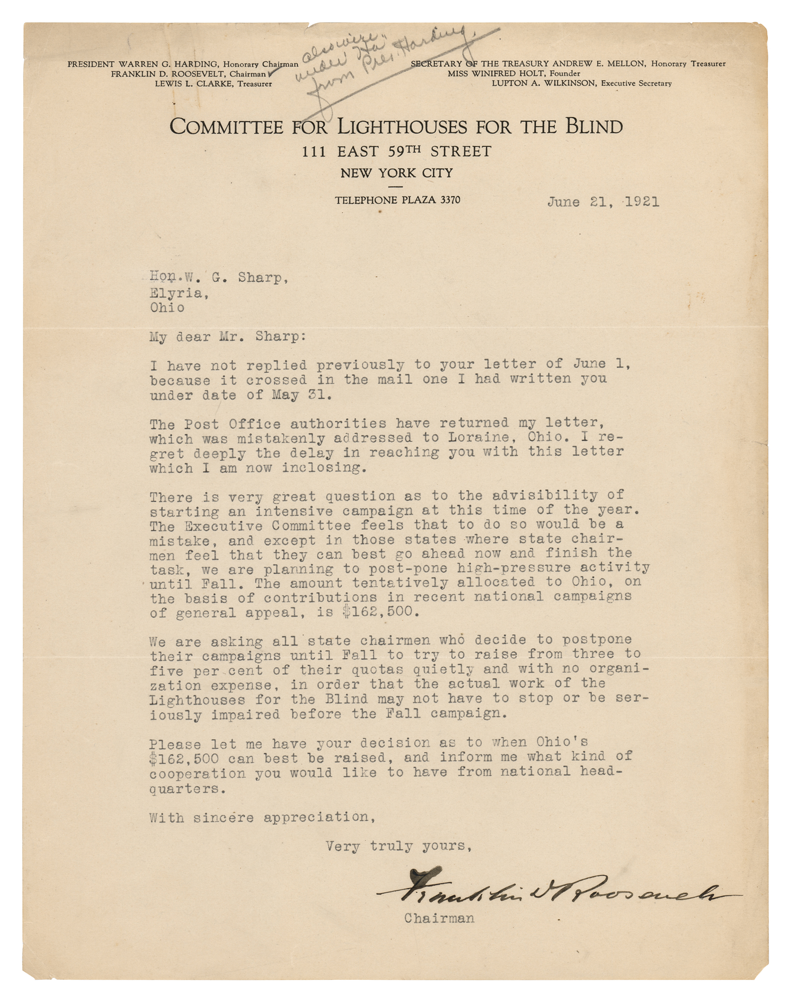TLS, one page, 8.5 x 11, Committee for Lighthouses for the Blind letterhead, June 21, 1921. Letter to William J. Sharp, in full: “I have not replied previously to your letter of June 1, because it crossed in the mail one I had written you under date of May 31. The Post Office authorities have returned my letter, which was mistakenly addressed to Loraine, Ohio. I regret deeply the delay in reaching you with this letter which I am now inclosing. There is very great question as to the advisibility of starting an intensive campaign at this time of the year. The Executive Committee feels that to do so would be a mistake, and except in those states where state chairmen feel that they can best go ahead now and finish the task, we are planning to post-pone high-pressure activity until Fall. The amount tentatively allocated to Ohio, on the basis of contributions in recent national campaigns of general appeal, is $162,500. We are asking all state chairmen who decide to postpone their campaigns until Fall to try to raise from three to five per cent of their quotas quietly and with no organization expense, in order that the actual work of the Lighthouses for the Blind may not have to stop or be seriously impaired before the Fall campaign. Please let me have your decision as to when Ohio's $162,500 can best be raised, and inform me what kind of cooperation you would like to have from national headquarters.” In fine condition. Among his many charitable and philanthropic activities at this time, FDR headed a $2 million fund drive for Lighthouses for the Blind.