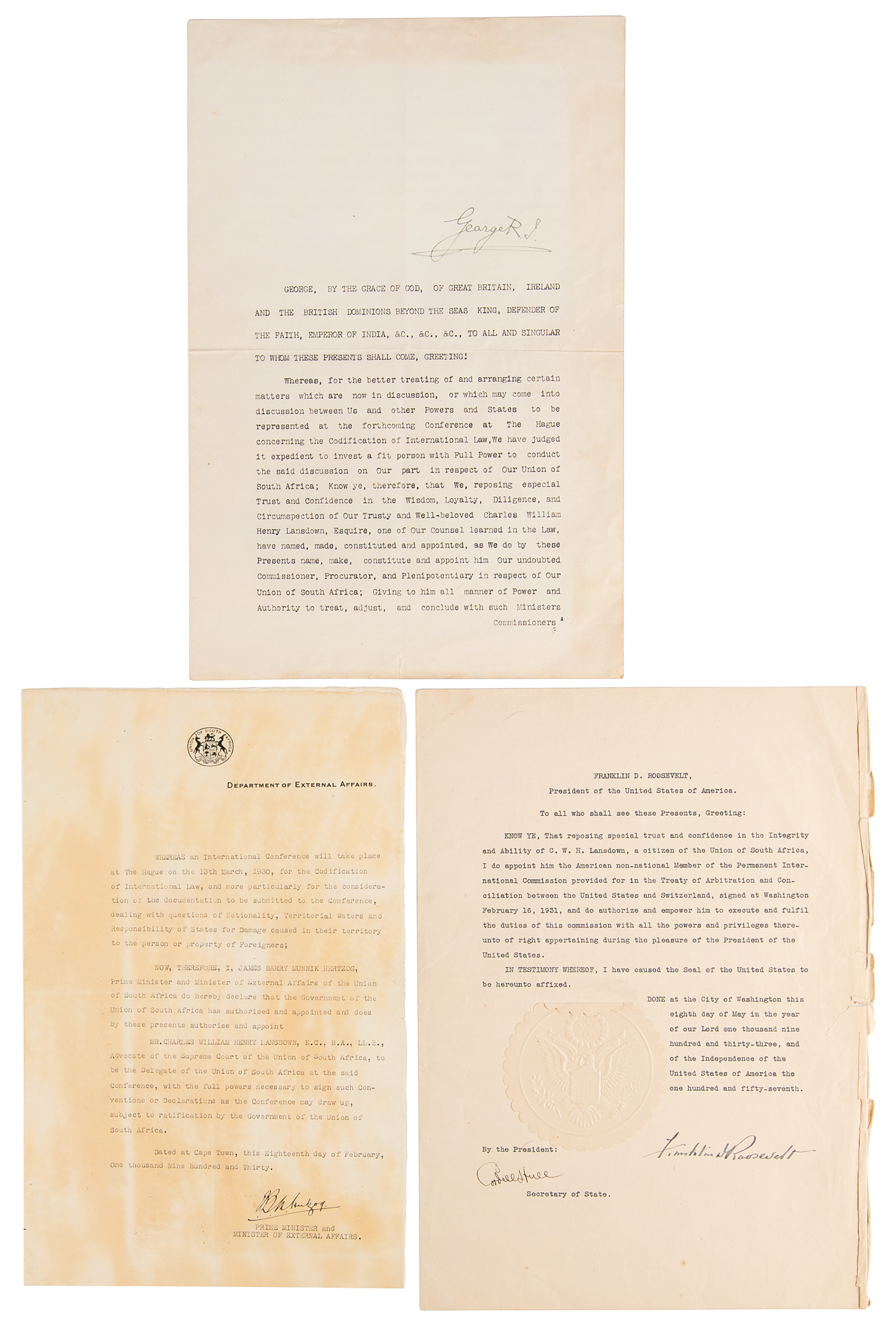 DS, signed “J. B. M. Herzog,” one page, 8.5 x 13.5, February 18, 1930. Prime Minister Herzog appoints Lansdown, “Advocate of the Supreme Court of the Union of South Africa, to be the Delegate of the Union of South Africa” at an International Conference that “will take place at The Hague of the 13 March, 1930, for the Codification of International Law, and more particularly for the consideration of the documentation to be submitted to the Conference, dealing with questions of Nationality, Territorial Waters and Responsibility of States for Damage caused in their territory to the person or property of Foreigners.” Signed at the conclusion by Herzog. In overall very good to fine condition, with staining to Herzog, edge toning to George, and edge wear to Roosevelt.
