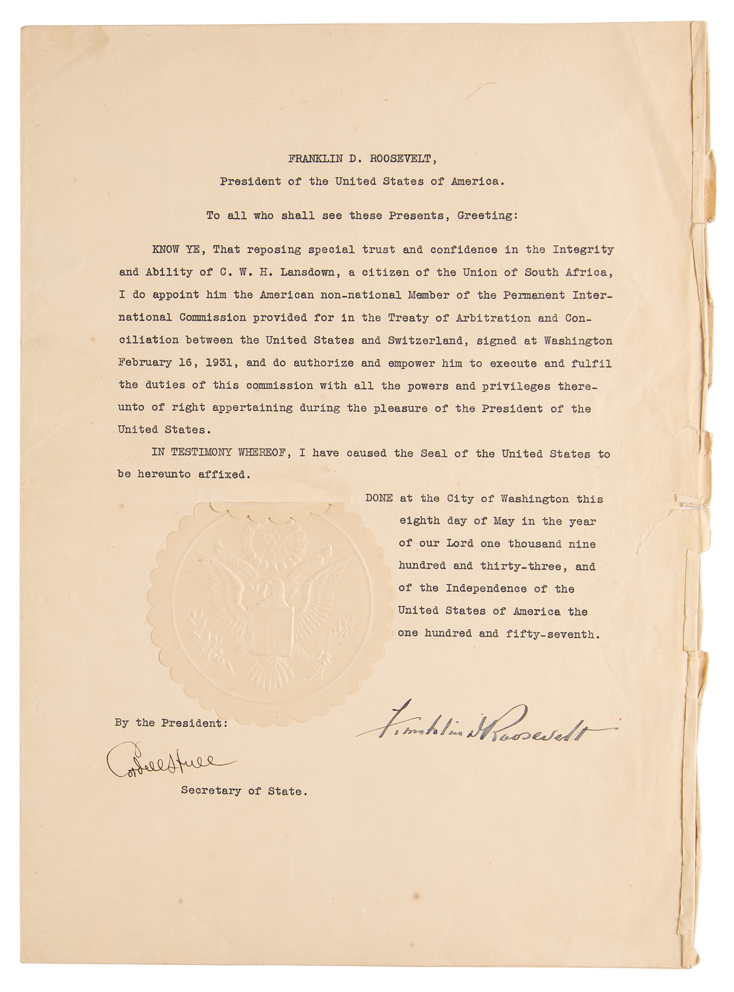 DS as president, signed “Franklin D. Roosevelt,” one page, 10 x 14, May 8, 1933. President Roosevelt appoints Lansdown as “the American non-national Member of the Permanent International Commission provided for in the Treaty of Arbitration and Conciliation between the United States and Switzerland, signed at Washington February 16, 1931.” Signed at the conclusion by Franklin D. Roosevelt and countersigned by Secretary of State Cordell Hull.