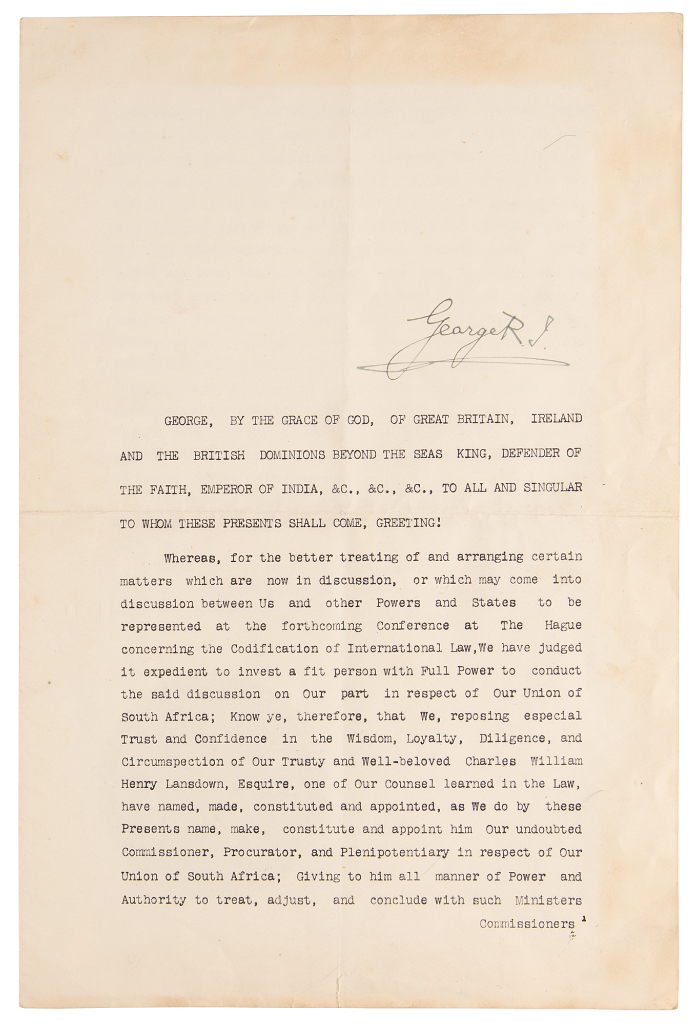 DS, signed “George R. I.,” two pages, 9.75 x 14.75, March 11, 1930. The king appoints Lansdown as “Our undoubted Commissioner, Procurator, and Plenipotentiary in respect of Our Union of South Africa,” at the forthcoming “Conference at the Hague concerning the Codification of International Law.” Signed at the top of the first page by King George V.