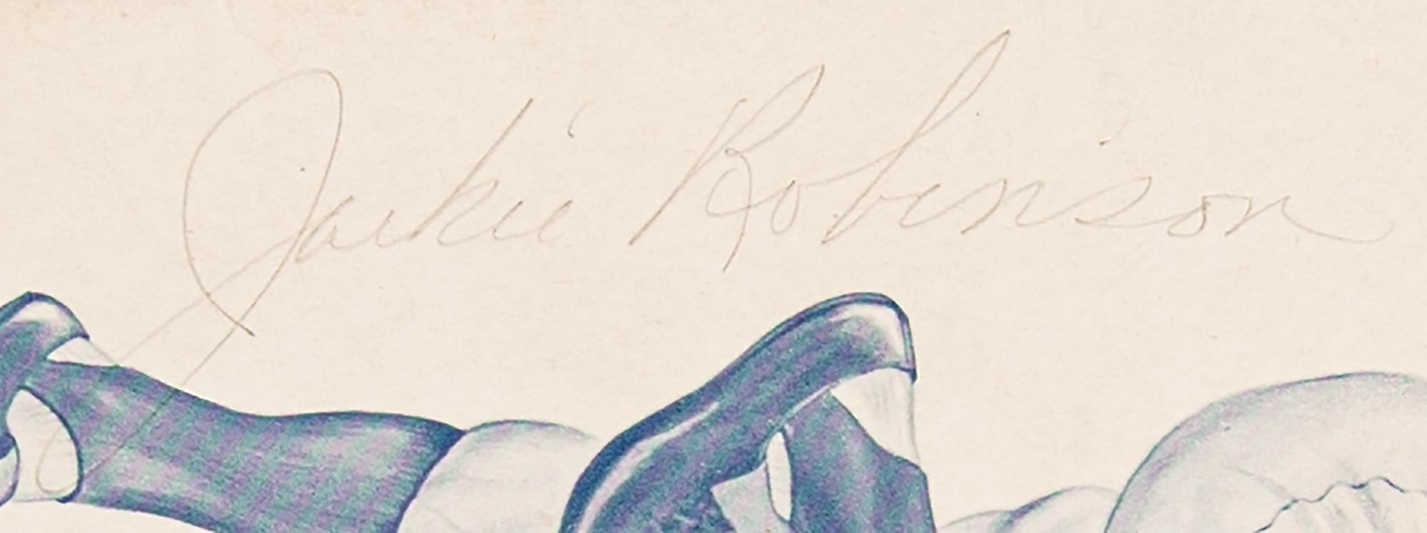 Attractive 1950 yearbook for the Brooklyn Dodgers, 48 pages, 8.5 x 11, signed vertically on the front cover in pencil by Jackie Robinson. The yearbook contains stats, biographies, and pictures for all of the Dodger players, a roster that includes Robinson, Pee Wee Reese, Duke Snider, Roy Campanella, and more. In fine condition, with light handling wear. Accompanied by a full letter of authenticity from JSA.