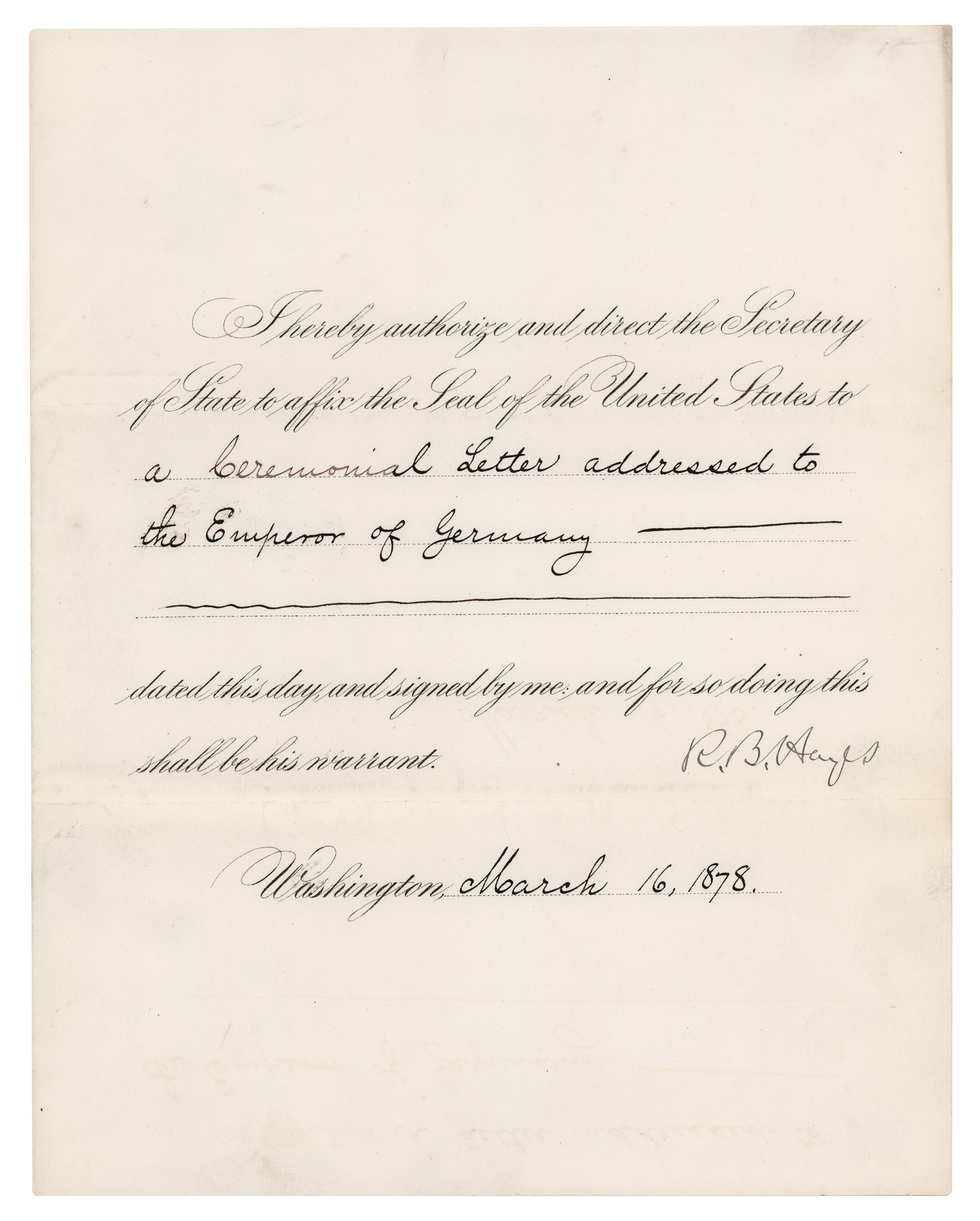 Partly-printed DS as president, signed “R. B. Hayes,” one page, 7.75 x 9.75, March 16, 1878. President Hayes directs the Secretary of State to affix the Seal of the United States to “a Ceremonial Letter addressed to the Emperor of Germany.” Signed at the conclusion by Rutherford B. Hayes. In fine condition. Although unconfirmed, the ceremony was likely the birthday of William I, German Emperor, who turned 81 on March 22, 1878. That year was not especially kind to William I, who survived assassination attempts in both May and June.