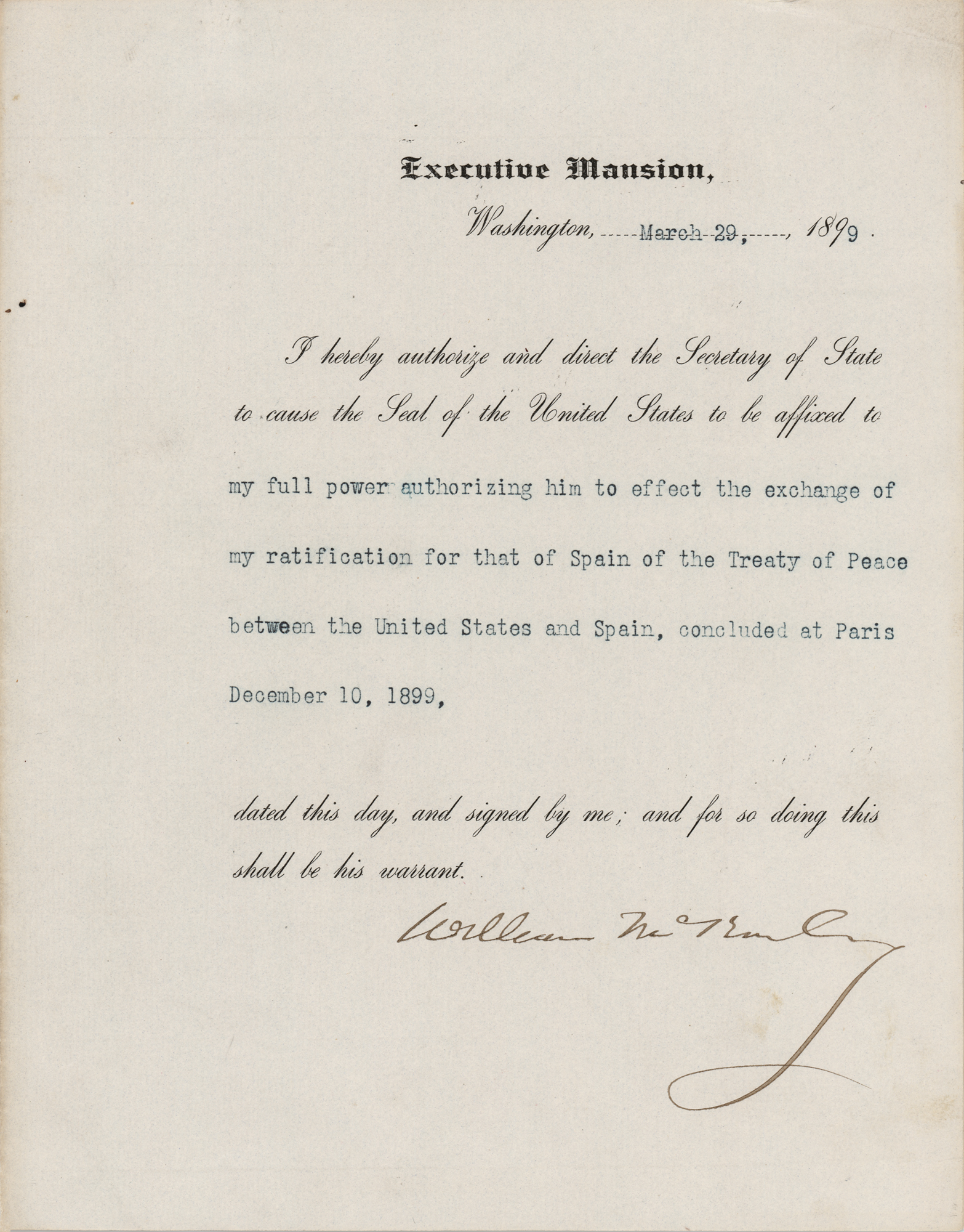 Historic DS as president, one page, 8 x 10, Executive Mansion letterhead, March 29, 1899. President McKinley directs the Secretary of State to cause the Seal of the United States to be affixed to “my full power authorizing him to effect the exchange of my ratification for that of Spain of the Treaty of Peace between the United States and Spain, concluded at Paris December 10, 189[8].” The document errantly lists the year date as 1899. Signed nicely at the conclusion by William McKinley. In fine condition. Accompanied by an original copy of an English-Spanish language 13-page booklet print of the “Treaty of Peace between the United States of America and the Kingdom of Spain.”