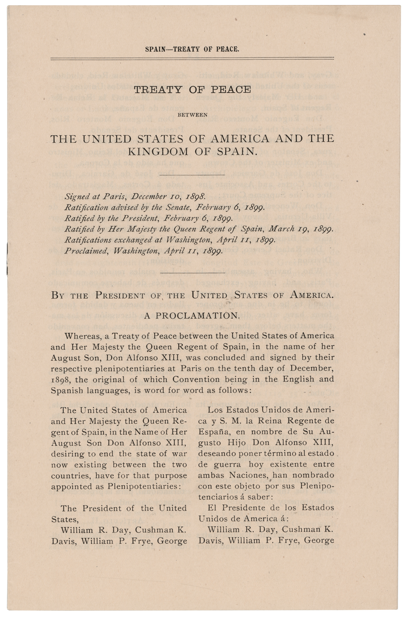Significant document signaling the end of the Spanish–American War, with President McKinley exchanging his ratification of “the Treaty of Peace between the United States and Spain”
