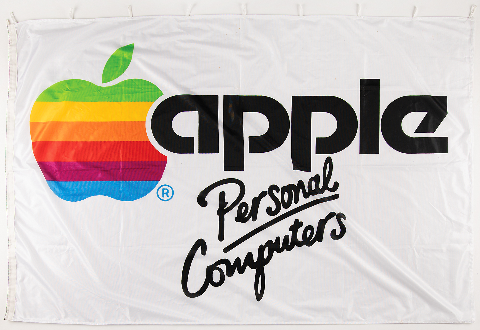 Circa 1979 vintage color 57 x 38 Apple Computer dealer banner with large Apple ‘rainbow’ logo next to black text: “Apple, Personal Computer.” The top edge bears several loops. In fine condition, with small light scattered stains and holes. An appealing example of ‘new old stock’ Apple merchandise.