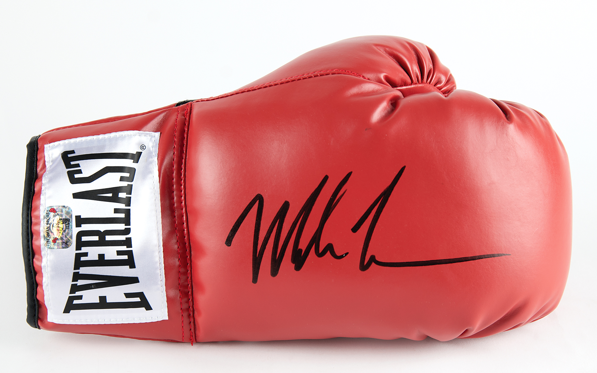 Red right-handed Everlast boxing glove, prominently signed in black felt tip by Mike Tyson. In very fine condition, with an authenticity label affixed to the wrist.
