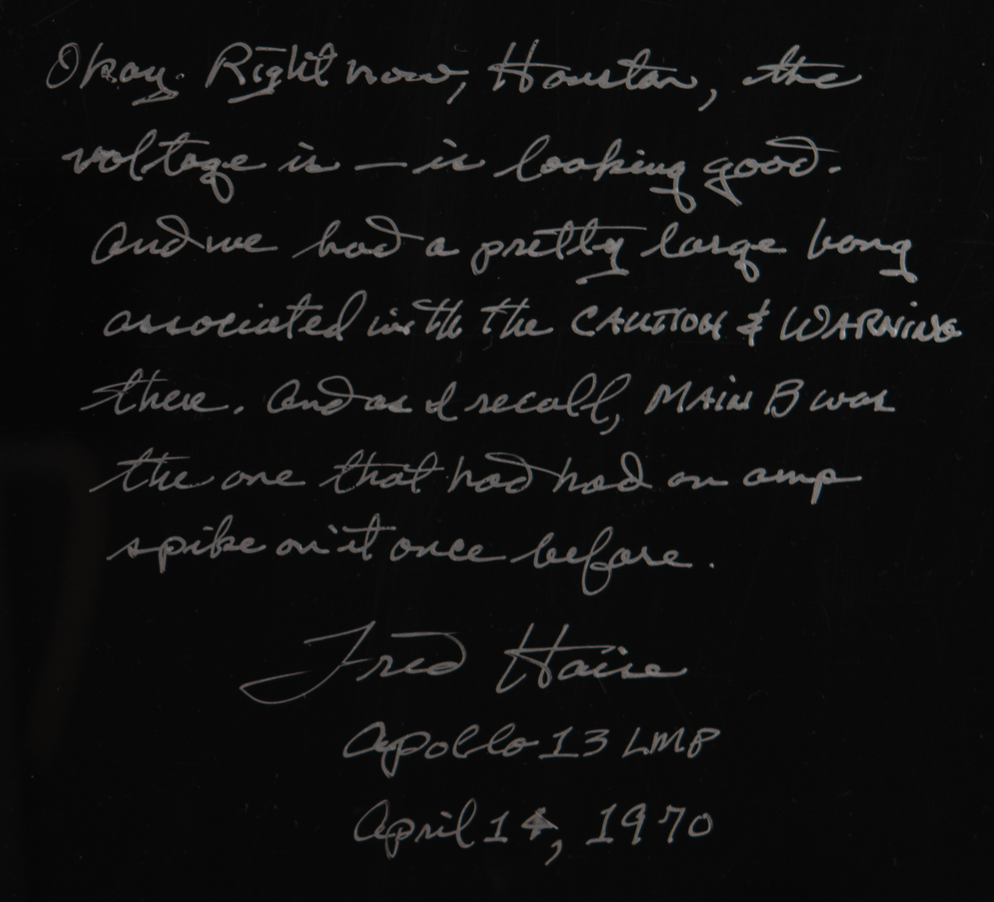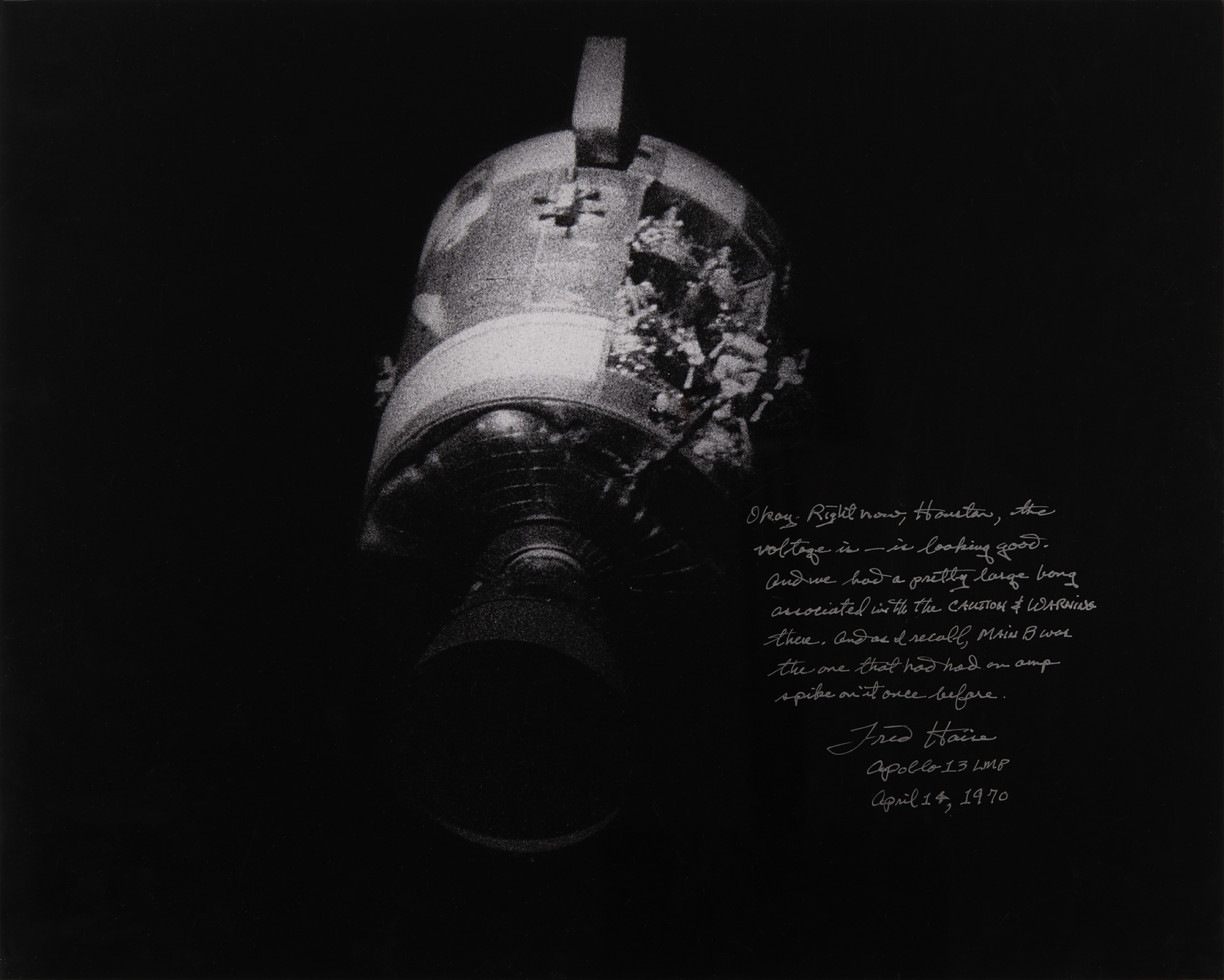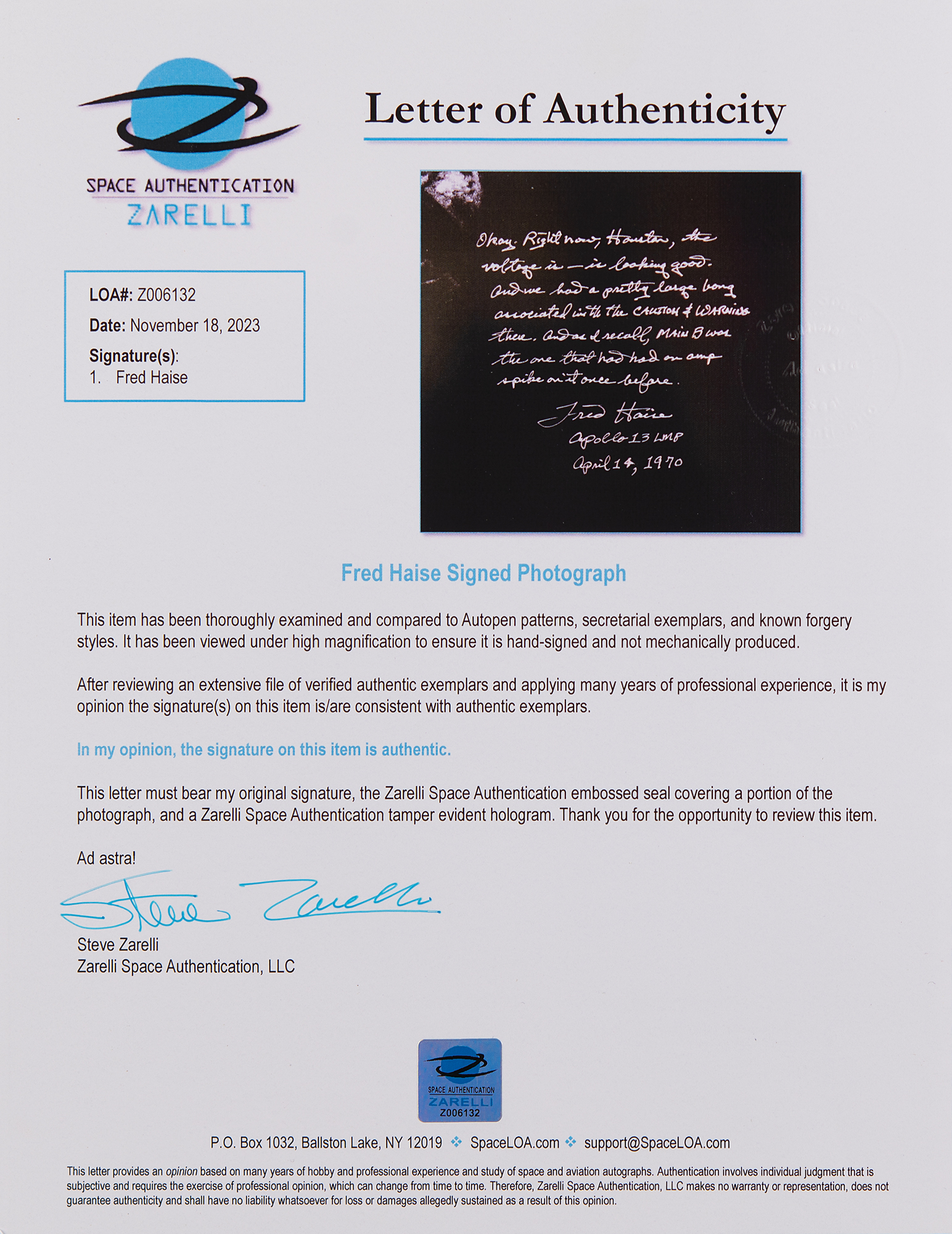 Satin-finish 20 x 16 photo of the damaged Apollo 13 capsule floating in space, signed in silver ink, “Fred Haise, Apollo 13 LMP, April 14, 1970," who adds above, “Okay. Right now, Houston, the voltage is—is looking good. And we had a pretty large bang associated with the Caution & Warning there. And as I recall, Main B was the one that had had an amp spike on it once before.” In very good condition, with scattered creasing in the background areas. Accompanied by a full letter of authenticity from Zarelli Space Authentication.