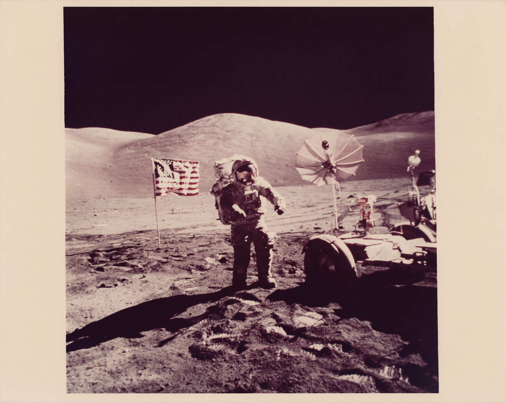 Official color semi-glossy 10 x 8 NASA photo of Apollo 17 CDR Gene Cernan walking toward the Lunar Roving Vehicle during EVA at the Taurus-Littrow landing site, with the American flag and large lunar mountains in the background. The photograph was taken by LMP Harrison Schmitt. Reverse bears light “This Paper Manufactured by Kodak” watermarks. In very fine condition. NASA cataloged this image AS17-140-21388.