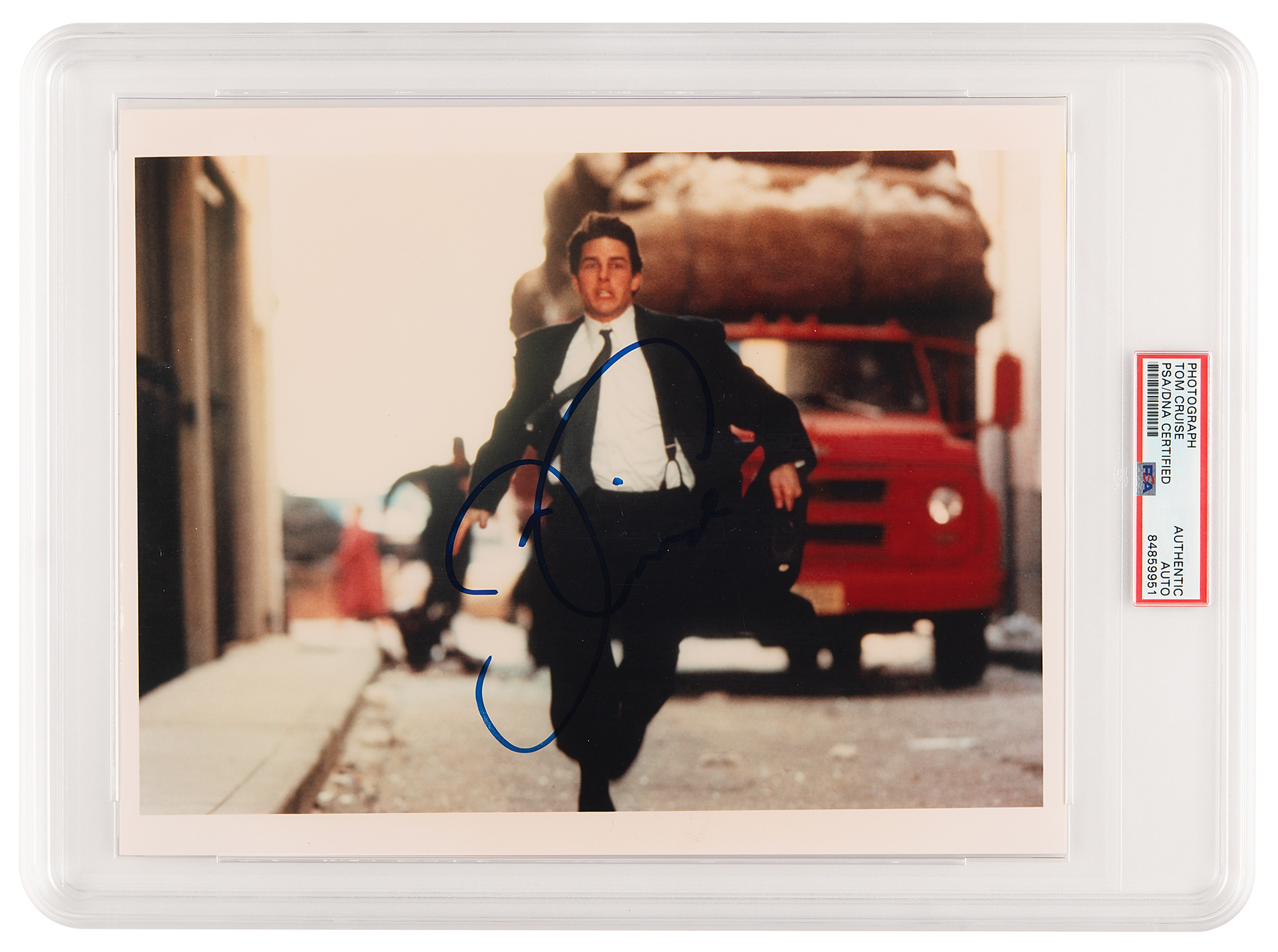 Color glossy 10 x 8 photo of Tom Cruise as Mitch McDeere in the legal thriller The Firm, signed in blue felt tip. In very fine condition. Encapsulated in a PSA/DNA authentication holder.
